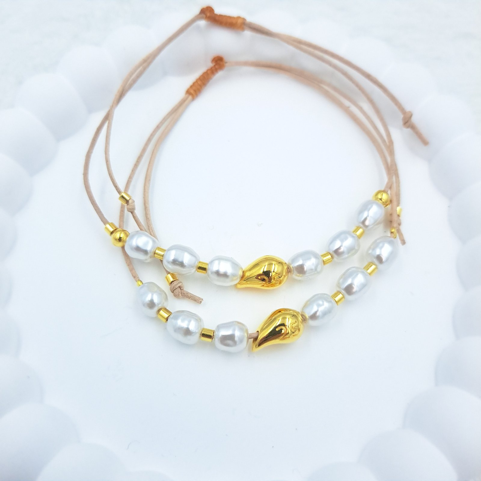 Βραχιόλι χρυσό μοτίφ, λευκή χάντρα . Οι φωτογραφίες έχουν υποστεί επεξεργασία και τα χρώματα ίσως να διαφέρουν λίγο στην πραγματικότητα. Η Τιμή αφορά συσκευασία ενός τεμαχίου. Σας αποστέλλεται με συσκευασία.