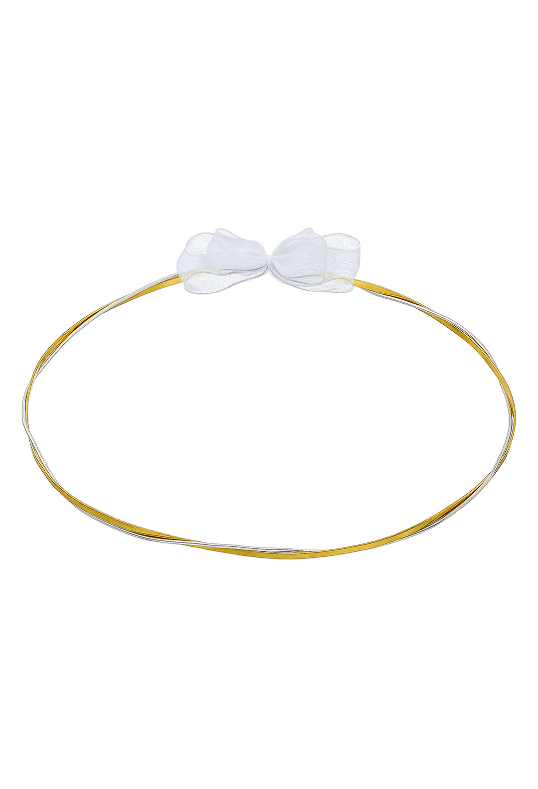 Κομψά δίχρωμα στέφανα γάμου, επάργυρα και επιχρυσωμένα, με αρμονικό δέσιμο δύο μετάλλων. Το διαχρονικό σχέδιο και η λευκή κορδέλα προσδίδουν ρομαντισμό και κομψότητα στην τελετή.
