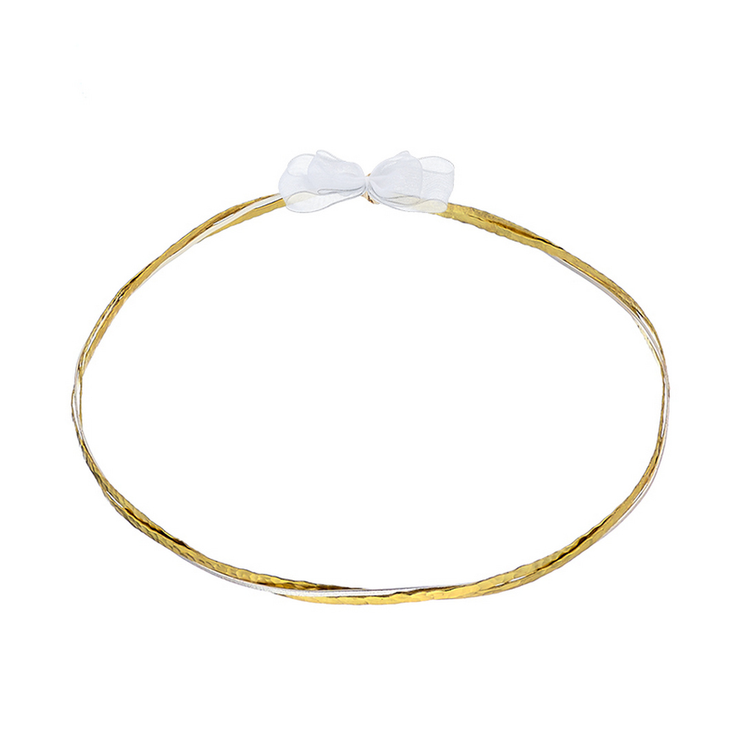 Αυτά τα μοναδικά στέφανα γάμου είναι κατασκευασμένα από υψηλής ποιότητας επαργυρωμένο υλικό και διακοσμημένα με διακριτική σφυρήλατη υφή, η οποία προσδίδει μια ιδιαίτερη λάμψη και φινέτσα. Ο συνδυασμός χρυσής και ασημένιας απόχρωσης συμβολίζει την ένωση δύο ξεχωριστών ψυχών σε έναν αρμονικό δεσμό αγάπης. Η λευκή σατέν κορδέλα που τα ενώνει ολοκληρώνει την ρομαντική και κομψή εμφάνισή τους. Ιδανική επιλογή για ζευγάρια που επιθυμούν έναν συνδυασμό παράδοσης και μοντέρνου στυλ στη γαμήλια τελετή τους.
