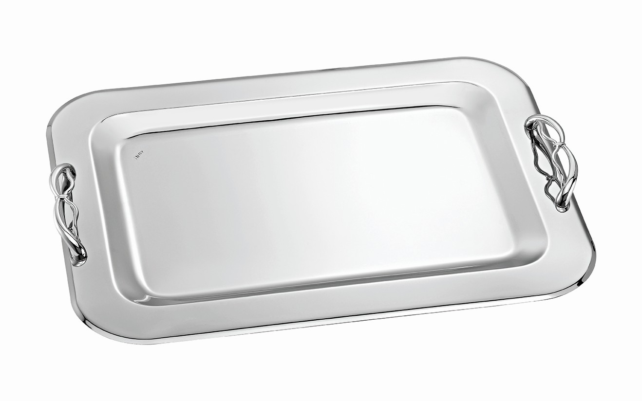 Ένας εντυπωσιακός ορθογώνιος δίσκος γάμου με λαμπερή, γυαλιστερή επιφάνεια και περίτεχνες ασημί λαβές, που αποπνέει φινέτσα και διαχρονική κομψότητα.