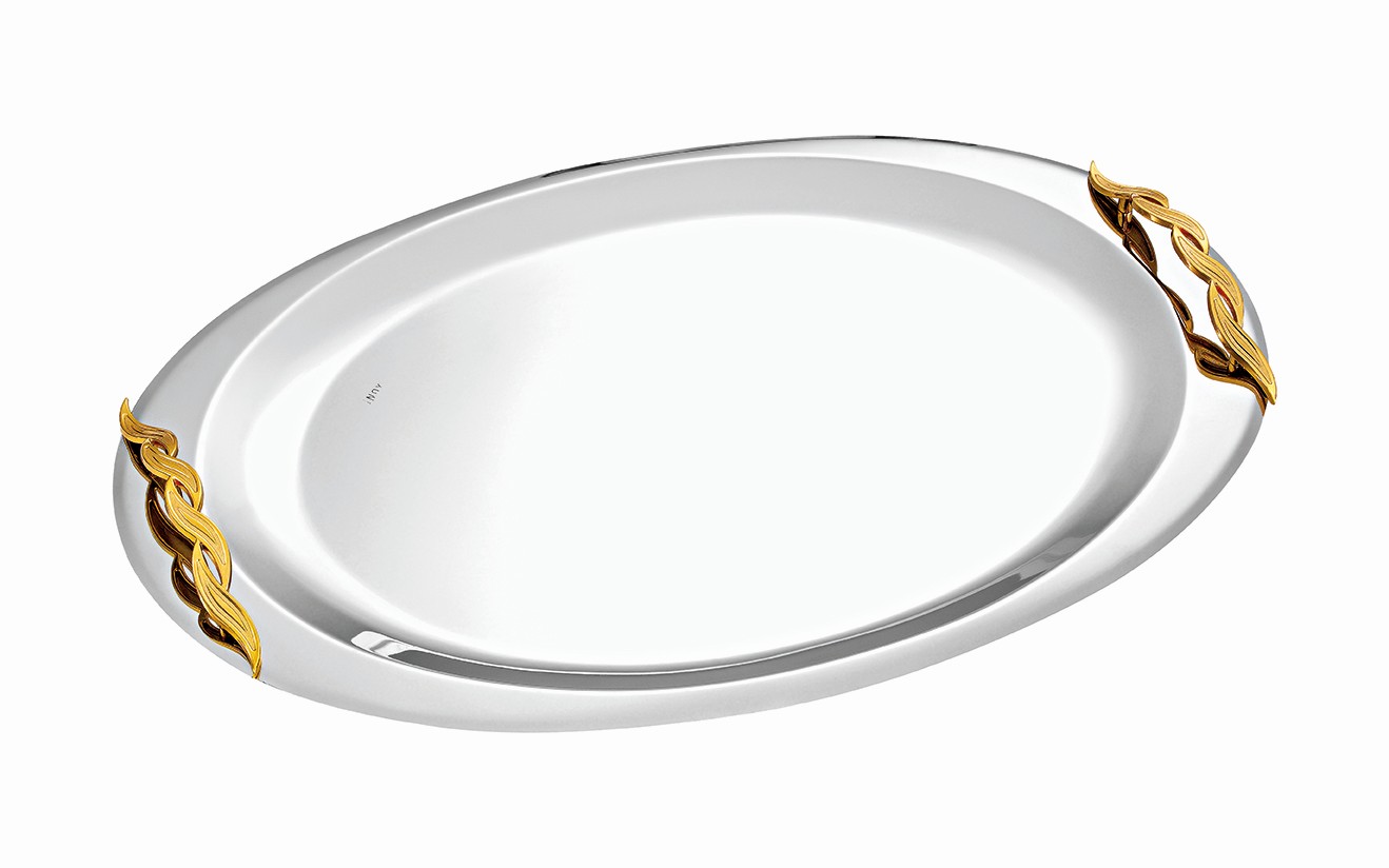 Ένας πολυτελής παραλληλόγραμμος δίσκος γάμου σε ασημί γυαλιστερό φινίρισμα, διακοσμημένος με εκλεπτυσμένες χρυσές λεπτομέρειες στις γωνίες. Ο διαχρονικός συνδυασμός του ασημένιου με το χρυσό προσδίδει αίσθηση κομψότητας και βασιλικής φινέτσας.