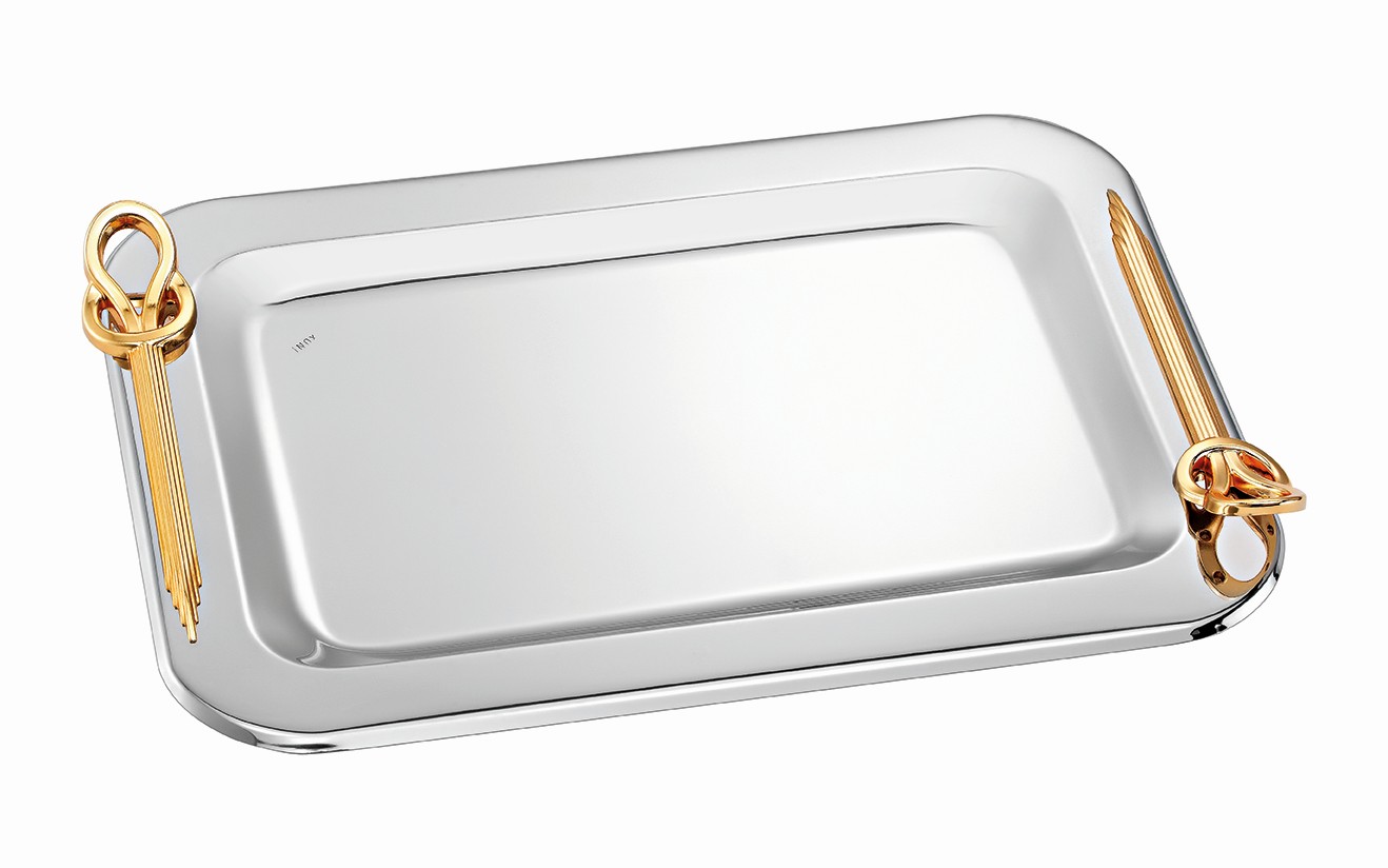 Ένας πολυτελής παραλληλόγραμμος δίσκος γάμου σε ασημί γυαλιστερό φινίρισμα, διακοσμημένος με εκλεπτυσμένες χρυσές λεπτομέρειες στις γωνίες. Ο διαχρονικός συνδυασμός του ασημένιου με το χρυσό προσδίδει αίσθηση κομψότητας και βασιλικής φινέτσας.