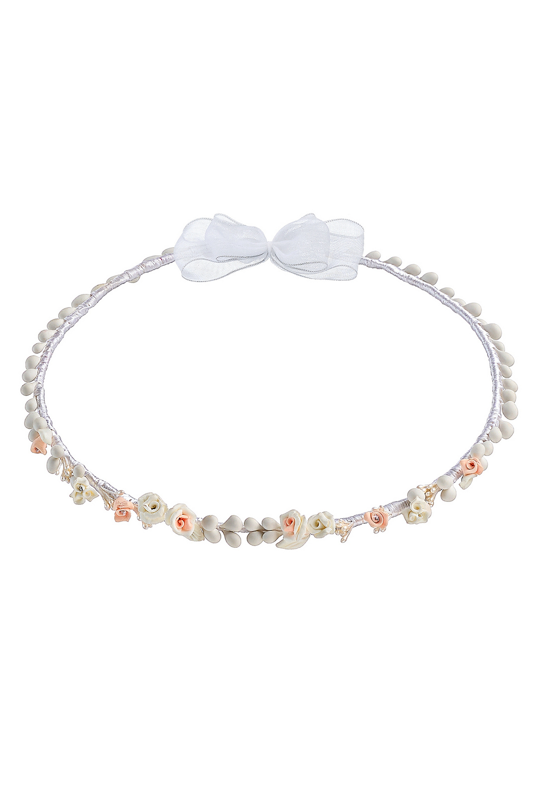 Λεπτεπίλεπτα επάργυρα στέφανα γάμου, στολισμένα με χειροποίητα πορσελάνινα τριαντάφυλλα σε ιβουάρ και απαλές ροδακινί αποχρώσεις. Η λευκή σατέν κορδέλα ενώνει τα στέφανα, συμβολίζοντας την αιώνια αγάπη και αφοσίωση του ζευγαριού.