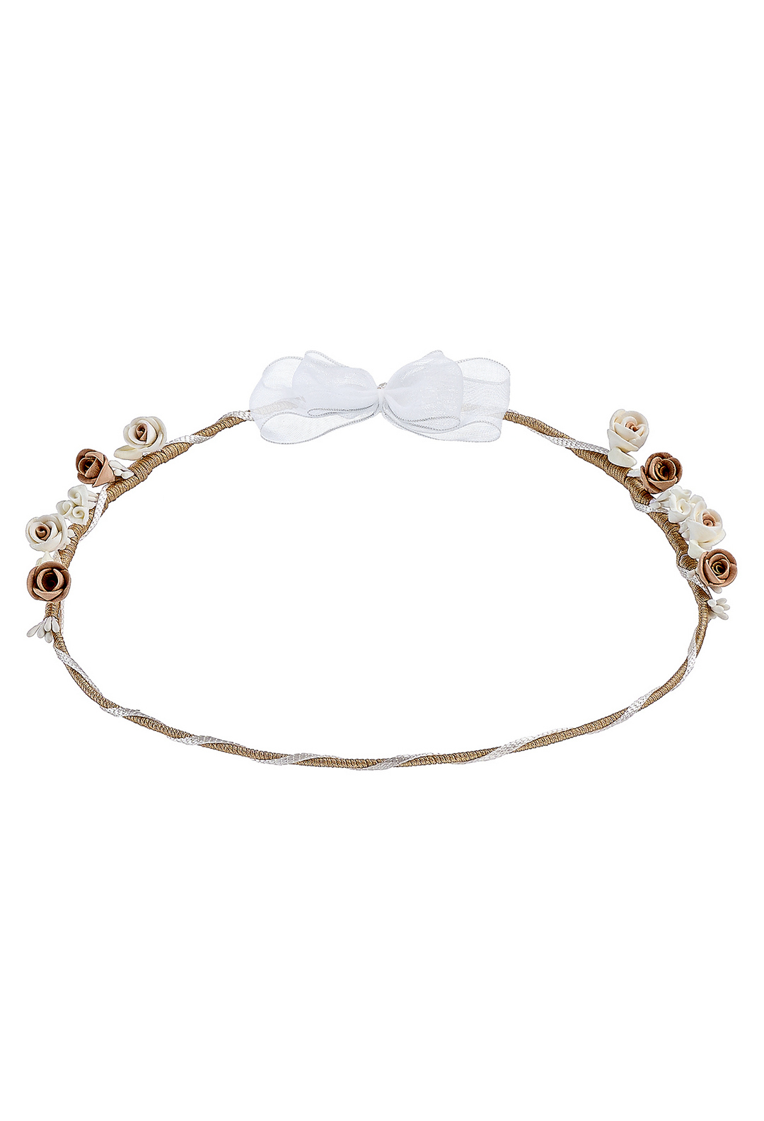 Συγκεκριμένα, τα στέφανα που φαίνονται στη φωτογραφία διαθέτουν μικρά, ρουστίκ λουλούδια σε γήινες αποχρώσεις, τα οποία είναι αραιά διακοσμημένα κατά μήκος του στεφάνου, δίνοντας έμφαση στην αέρινη αίσθηση. Η πλέξη του στεφάνου με χρυσή κλωστή, μαζί με την προσθήκη ενός μεγάλου, λευκού φιόγκου στο πίσω μέρος, ενισχύει την αίσθηση της φυσικής κομψότητας.
