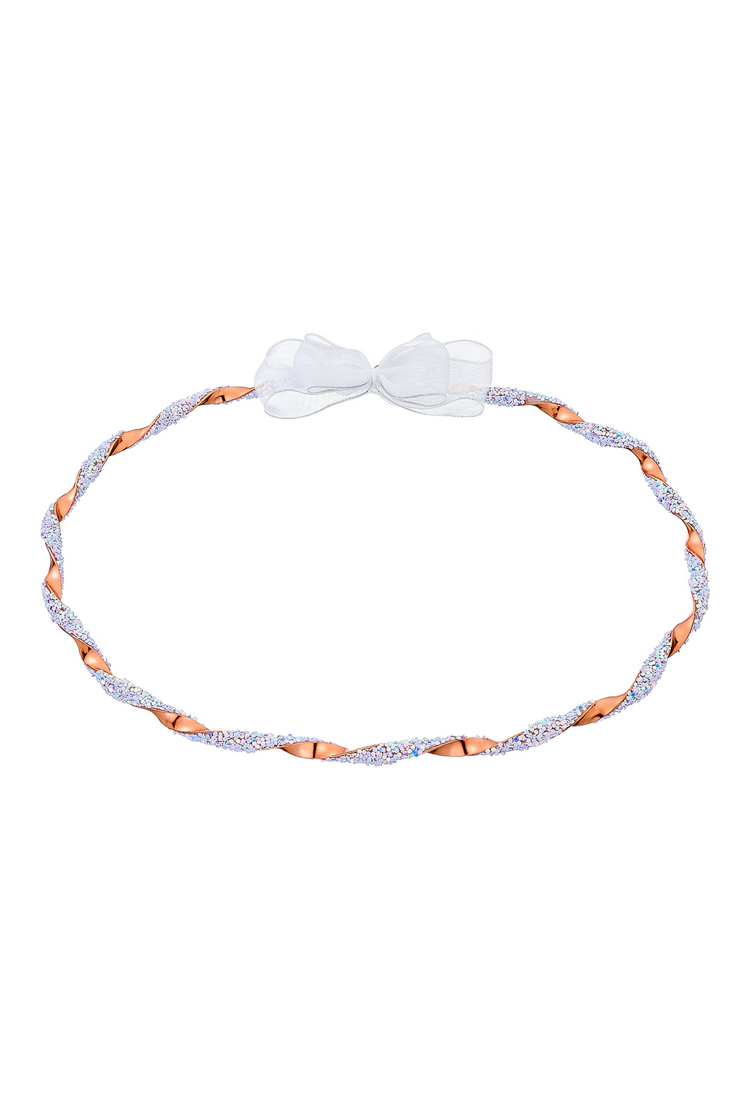 Εντυπωσιακά επάργυρα στέφανα γάμου, διακοσμημένα με λαμπερά κρύσταλλα και εναλλασσόμενες στριφτές λεπτομέρειες από ασήμι και ροζ χρυσό. Ολοκληρώνονται με έναν φίνο λευκό φιόγκο, αποπνέοντας κομψότητα και ρομαντισμό.