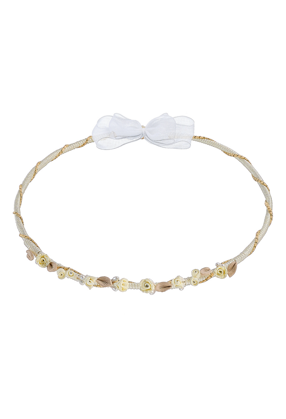 Εντυπωσιακά επάργυρα στέφανα γάμου με διακριτικές χρυσές πινελιές, πορσελάνινα τριαντάφυλλα σε ιβουάρ απόχρωση και λεπτομέρειες από πέρλες και κορδέλες. Η λευκή οργάντζα ολοκληρώνει το σύνολο, προσφέροντας ρομαντική κομψότητα.