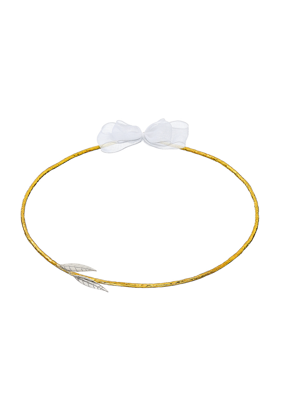 Επάργυρα στέφανα γάμου με χρυσές λεπτομέρειες και διακοσμητικά ασημένια φύλλα. Δεμένα με λευκή οργάντζα, συμβολίζουν την ένωση και την αρμονία.