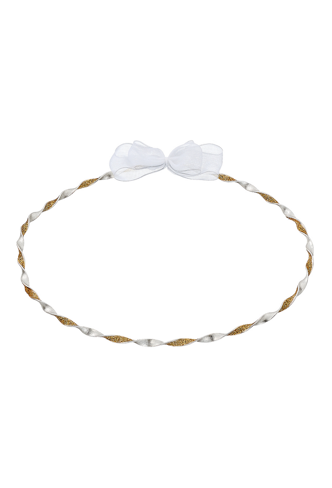 Κομψά επάργυρα στέφανα γάμου με χρυσές λεπτομέρειες και λευκή οργάντζα. Ένα διαχρονικό σχέδιο που αποπνέει ρομαντισμό και κομψότητα.