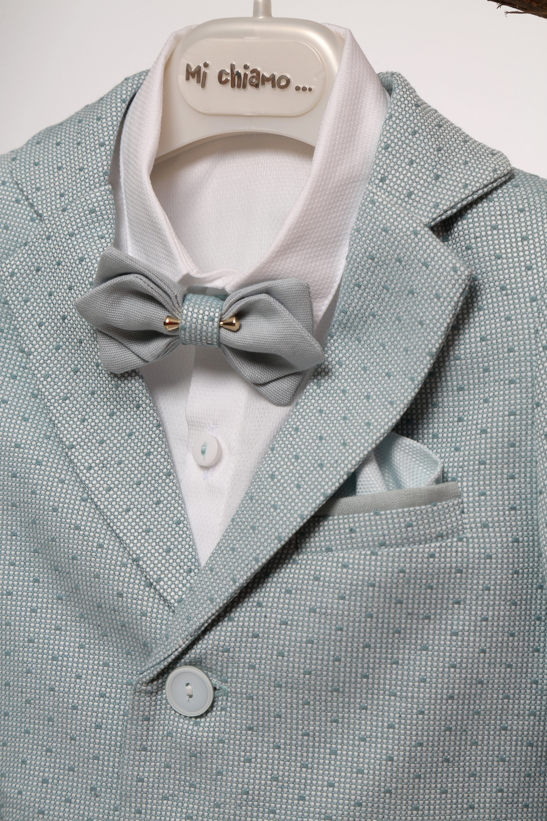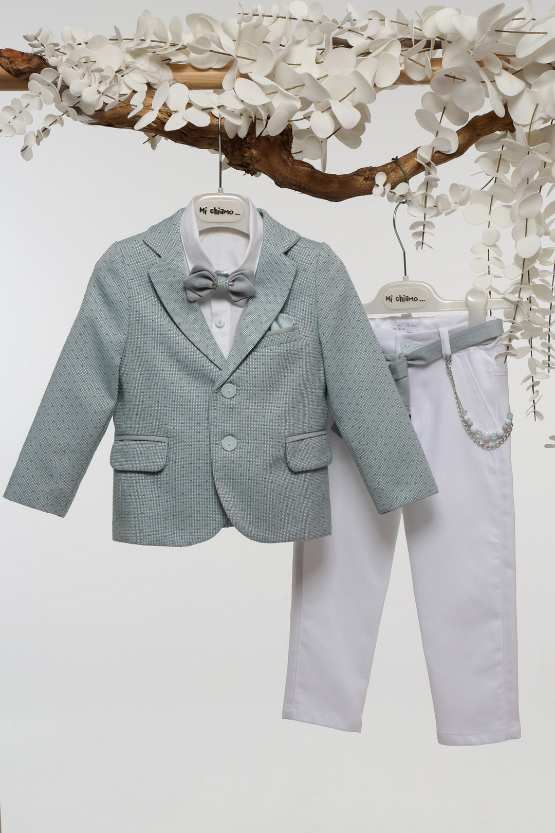 “Ένα εκλεπτυσμένο βαπτιστικό σύνολο για αγόρι, ιδανικό για μια ξεχωριστή τελετή. Το γκρι ανοιχτό σακάκι με διακριτικό μοτίβο και το ασορτί παπιγιόν προσδίδουν μια αριστοκρατική πινελιά, ενώ το λευκό παντελόνι με γκρι ζώνη και αλυσίδα ολοκληρώνει το look με άνεση και στυλ.”