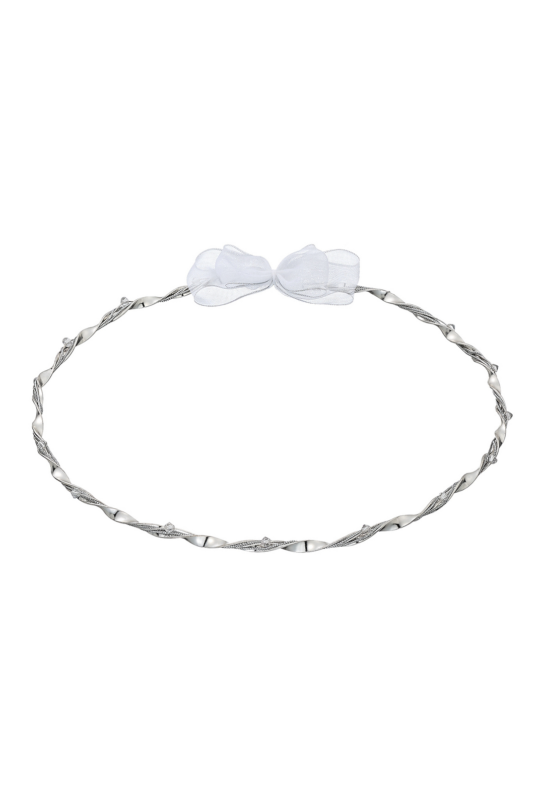 Εντυπωσιακά επάργυρα στέφανα γάμου με μοναδικό στριφτό σχέδιο και διακριτικές λαμπερές πέτρες. Συμβολίζουν την ένωση και την αιώνια αγάπη του ζευγαριού, ενώ η λευκή κορδέλα προσθέτει ρομαντική φινέτσα.