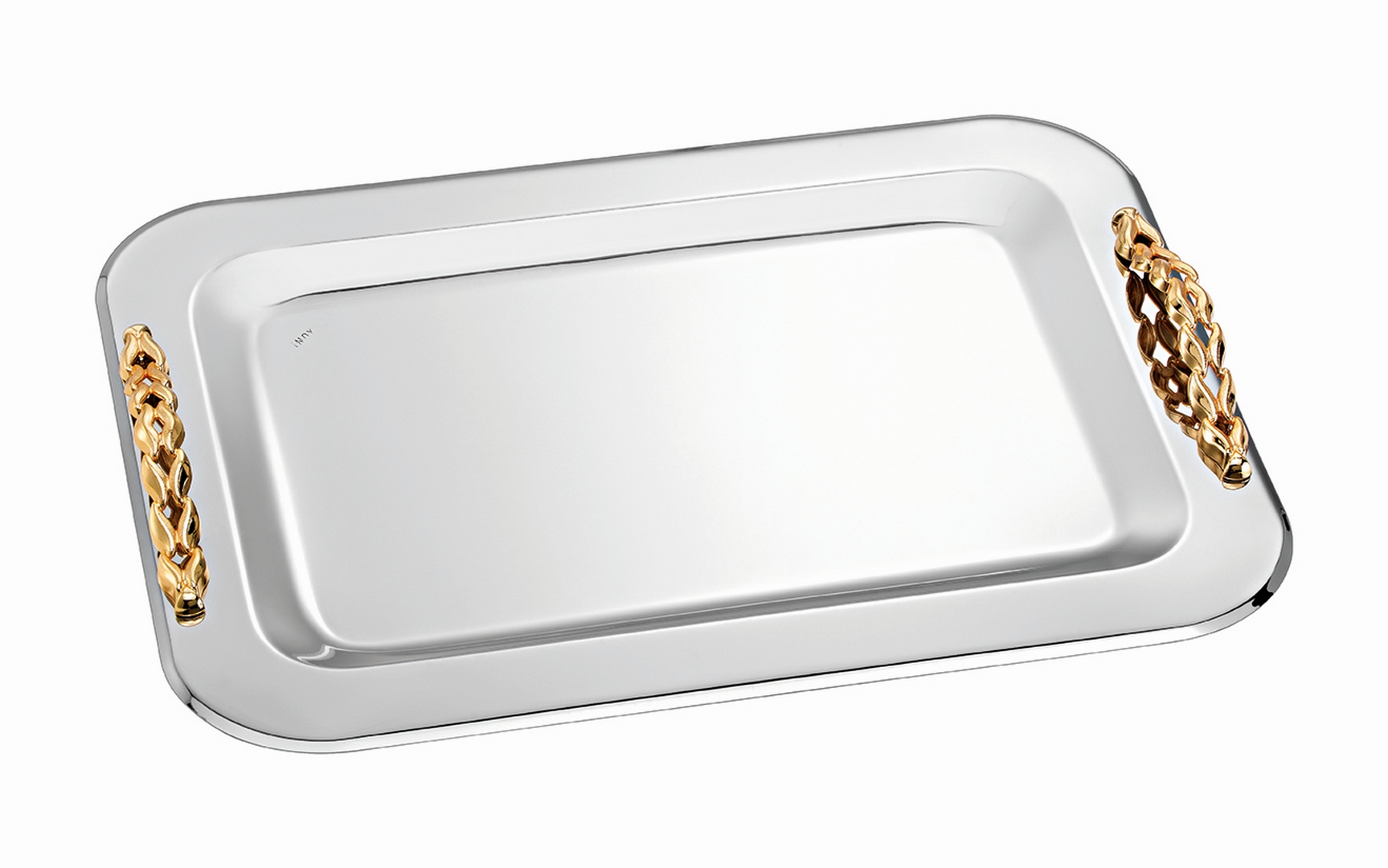 Κομψός ασημένιος δίσκος γάμου με περίτεχνες χρυσές λαβές, ιδανικός για μια εντυπωσιακή παρουσίαση των στέφανων και των ποτηριών.