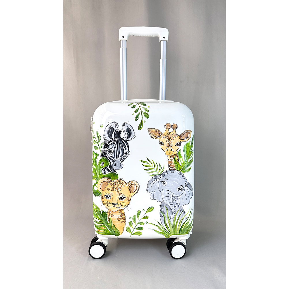 Λευκή βαπτιστική βαλίτσα με χαρούμενη ζωγραφιά ζώων της ζούγκλας, όπως καμηλοπάρδαλη, ελέφαντας, ζέβρα και λιονταράκι, περιτριγυρισμένα από πράσινα φύλλα. Ιδανική για μια παιχνιδιάρικη και χαριτωμένη εμφάνιση στη βάπτιση.
