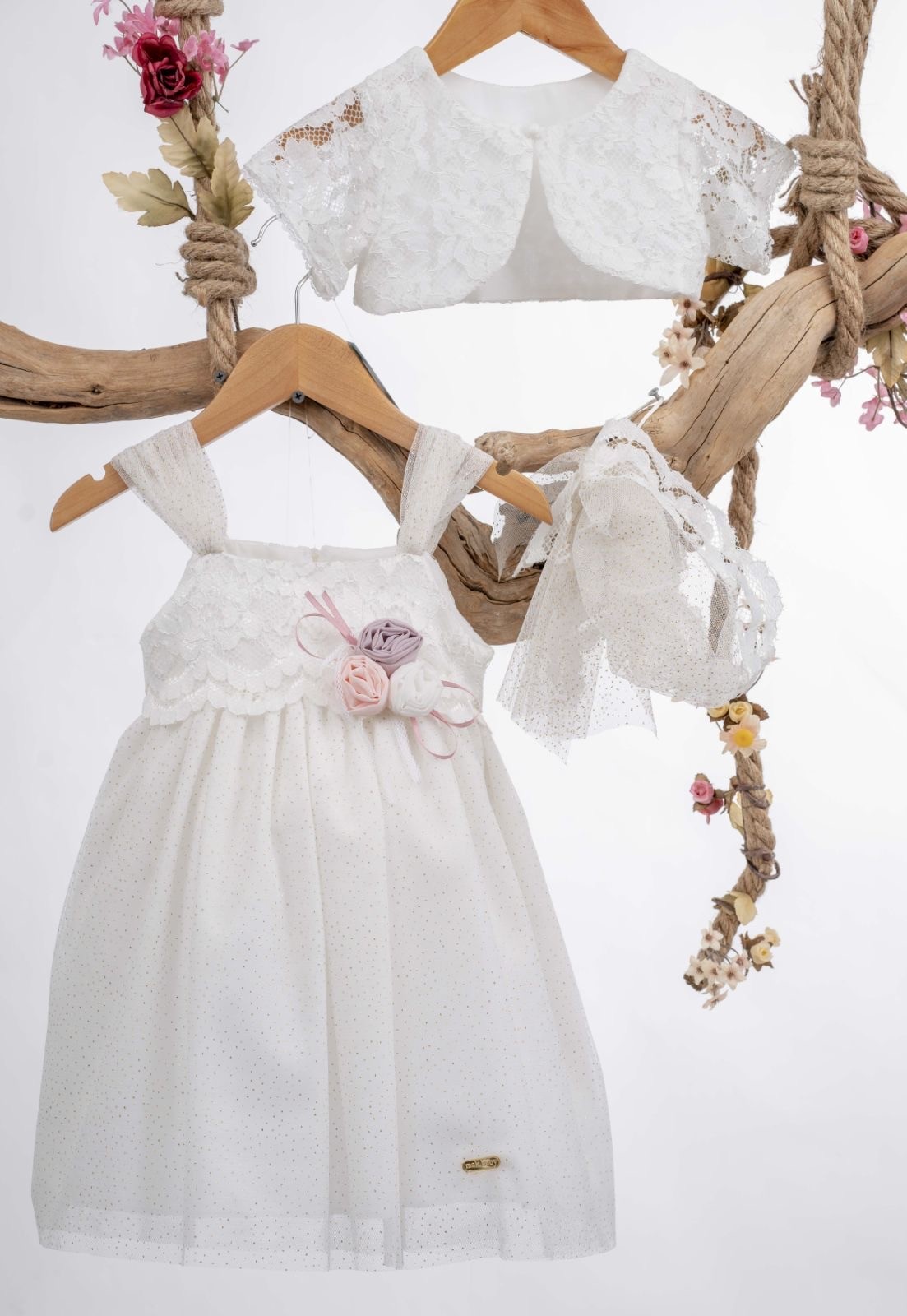 Η φωτογραφία παρουσιάζει ένα υπέροχο βαπτιστικό σύνολο, ιδανικό για μια μικρή πριγκίπισσα. Το σετ αποτελείται από ένα λευκό φόρεμα με πουά λεπτομέρειες και περίτεχνη δαντέλα, που προσδίδει μια αίσθηση ανάλαφρης κομψότητας. Στο στήθος του φορέματος, ένα μπουκέτο από ροζ λουλούδια και κορδέλες προσθέτει μια ρομαντική και παιχνιδιάρικη πινελιά. Στο πάνω μέρος, ένα λευκό μπολερό με δαντέλα συμπληρώνει το σύνολο, προσφέροντας μια αίσθηση ζεστασιάς και στυλ. Δίπλα στο φόρεμα, ένα ασορτί καπέλο με δαντέλα και ροζ λουλούδια ολοκληρώνει την εικόνα της αθωότητας. Το σύνολο είναι κρεμασμένο σε μια ξύλινη κρεμάστρα, ενώ στο φόντο, μια διακοσμητική κατασκευή από ξύλο και άνθη δημιουργεί μια ονειρική ατμόσφαιρα. Η απαλή σκιά και το φως αναδεικνύουν τις λεπτομέρειες του συνόλου, δημιουργώντας μια αίσθηση τρισδιάστατης υφής. Το σύνολο αποπνέει μια ατμόσφαιρα γιορτής και χαράς, ιδανική για μια ιδιαίτερη περίσταση όπως η βάπτιση.