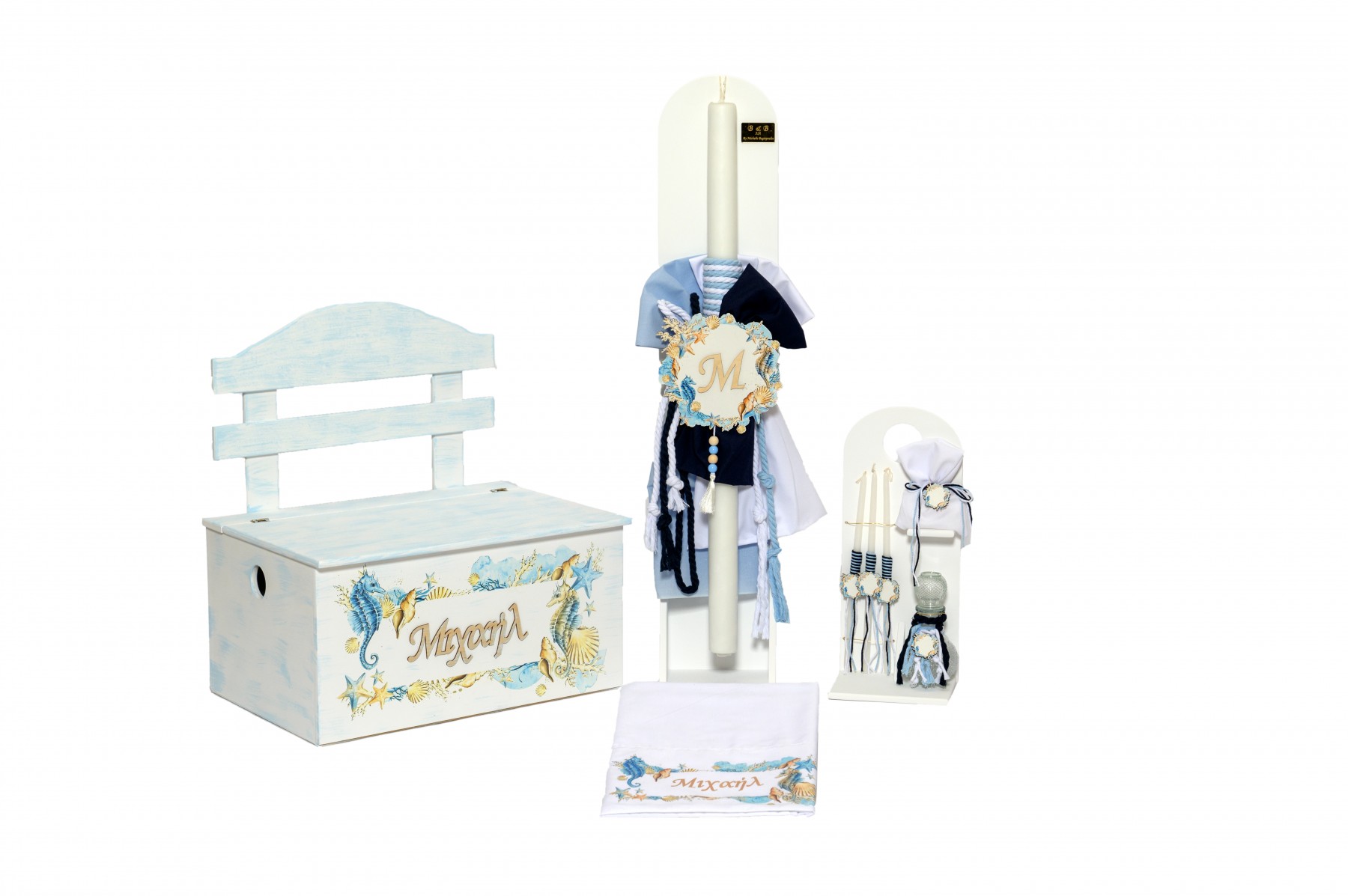 Σετ βάπτισης αγόρι με θαλασσινό θέμα και το όνομα του παιδιού.