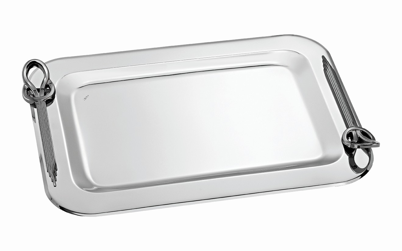 Ένας εντυπωσιακός παραλληλόγραμμος δίσκος γάμου, κατασκευασμένος από λαμπερό ασημί υλικό, με περίτεχνες διακοσμητικές λεπτομέρειες στις γωνίες. Ιδανικός για μια κομψή και εκλεπτυσμένη παρουσίαση του γαμήλιου τελετουργικού.