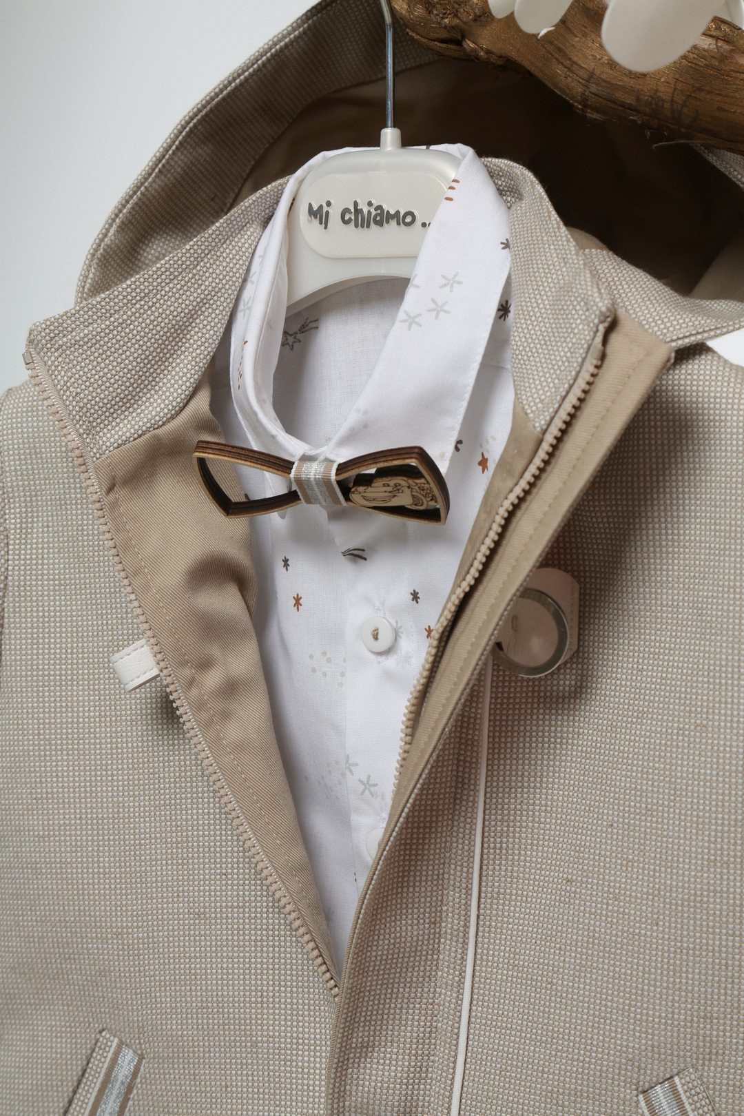 Αυτό το υπέροχο βαπτιστικό σύνολο για αγόρι συνδυάζει την κομψότητα με την άνεση, καθιστώντας το ιδανικό για τη σημαντική ημέρα της βάπτισης. Το σακάκι, σε μια απαλή μπεζ απόχρωση, διαθέτει διακριτικό καρό σχέδιο και κουκούλα, προσφέροντας στυλ και πρακτικότητα. Το λευκό πουκάμισο, με τα διακριτικά σχέδια, προσθέτει μια πινελιά φρεσκάδας, ενώ το παπιγιόν ολοκληρώνει το look με μια κλασική κομψότητα. Το παντελόνι, σε αρμονική μπεζ απόχρωση, είναι σχεδιασμένο για να προσφέρει άνεση καθ’ όλη τη διάρκεια της ημέρας.
