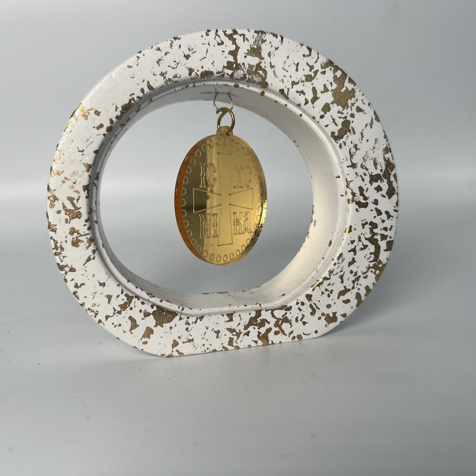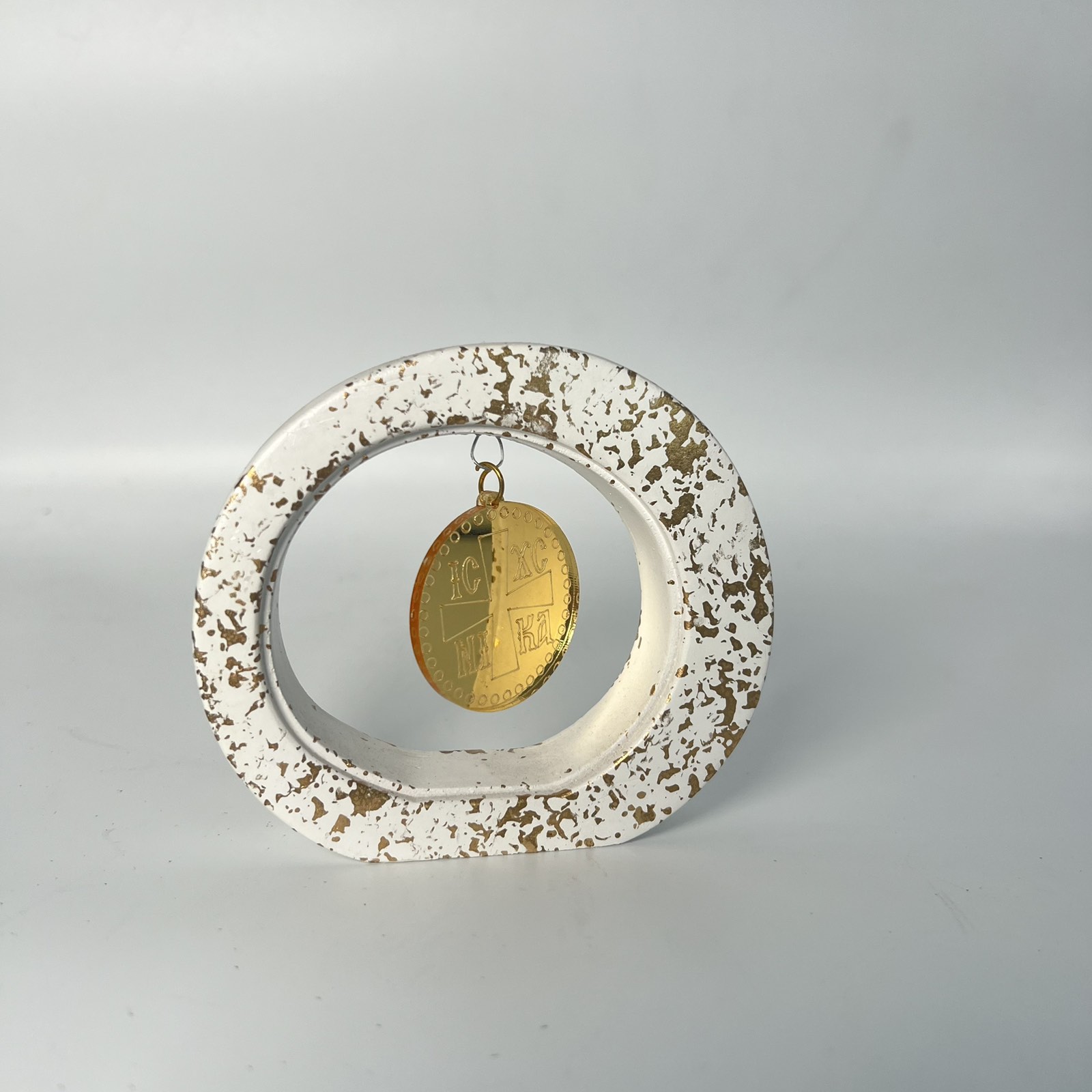 Μια μοντέρνα μπομπονιέρα, με κυκλική βάση από λευκό υλικό με χρυσές λεπτομέρειες και ένα χρυσό μετάλλιο που κρέμεται στο κέντρο, προσφέρει ένα κομψό και εντυπωσιακό δώρο.