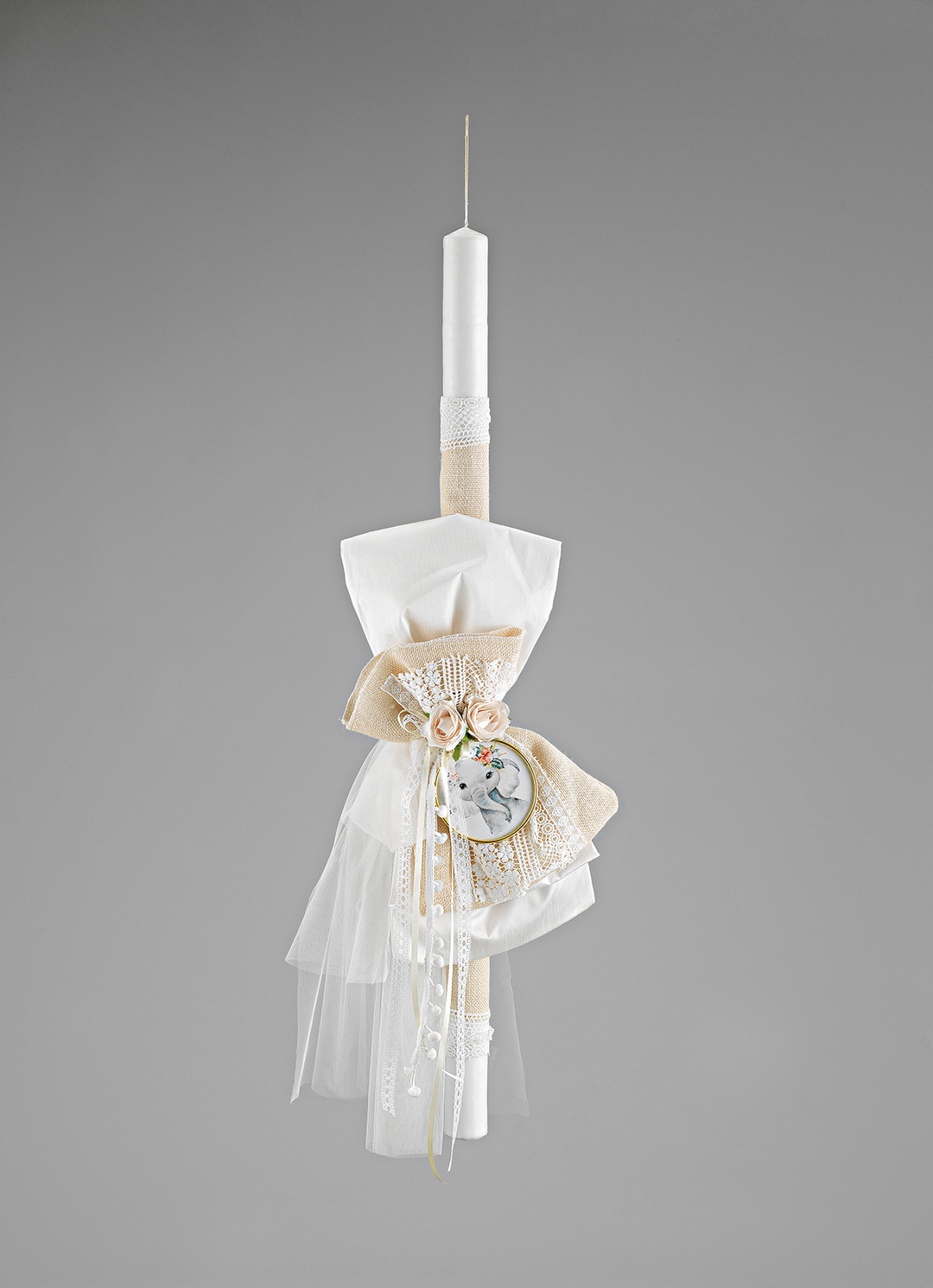 Οι αέρινες τούλινες λεπτομέρειες συμπληρώνουν την κομψότητα της λαμπάδας, κάνοντάς την ιδανική για μια βάπτιση με φυσικό, vintage και boho στυλ.