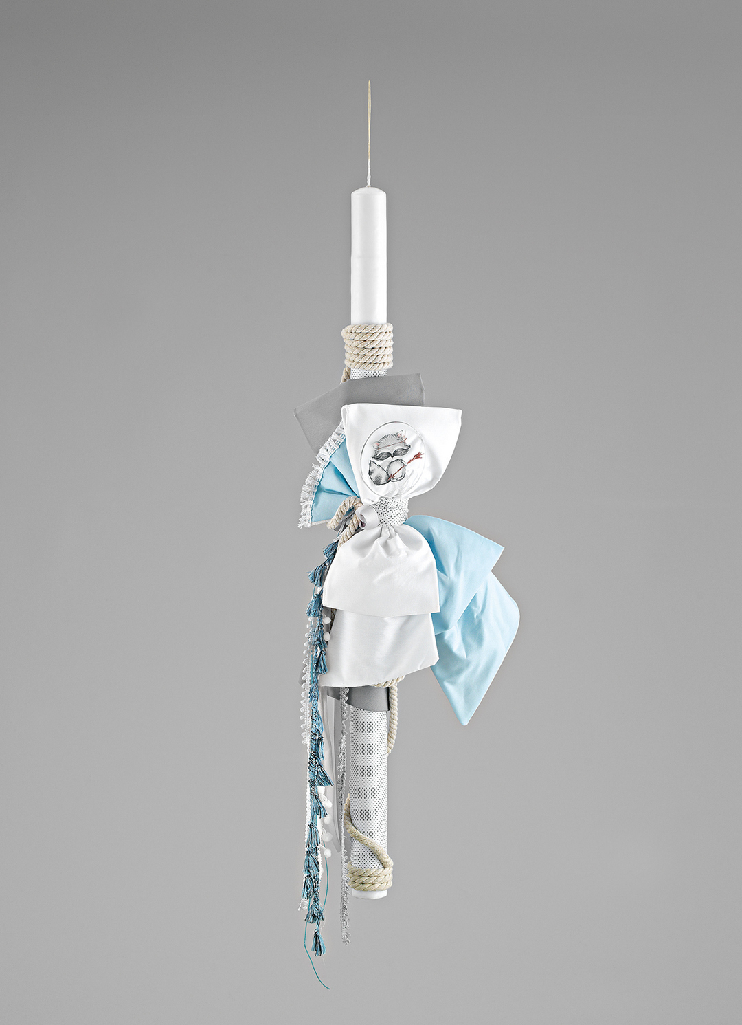 Μια ξεχωριστή λαμπάδα βάπτισης με ναυτική αισθητική, ιδανική για μια καλοκαιρινή βάπτιση με θαλασσινό χαρακτήρα. Το λευκό κερί είναι διακοσμημένο με έναν εντυπωσιακό συνδυασμό υφασμάτων σε λευκές, γαλάζιες και γκρι αποχρώσεις, δίνοντας μια αρμονική και κομψή εμφάνιση. Στο κέντρο της λαμπάδας δεσπόζει ένας όμορφος φιόγκος, επάνω στον οποίο υπάρχει ένα μεταλλικό διακοσμητικό με γυαλιά καταδύσεων και ψαράκι, αποπνέοντας μια αίσθηση περιπέτειας και εξερεύνησης του βυθού. Συμπληρωματικά στοιχεία, όπως σχοινιά, δαντέλες και κρόσσια σε γαλάζιους και λευκούς τόνους, προσδίδουν μια μοναδική και ιδιαίτερη πινελιά, κάνοντάς την μια εξαιρετική επιλογή για μια βάπτιση με ναυτικό θέμα.