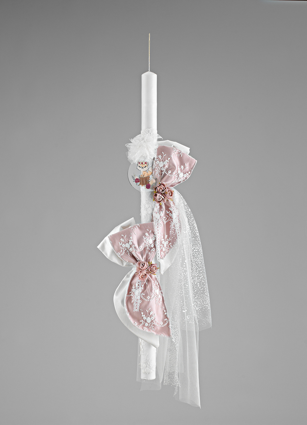 Λαμπάδα βάπτισης με ρομαντικές κορδέλες σε απαλό ροζ και λευκό, διακοσμημένη με φίνα δαντέλα, χειροποίητα τριαντάφυλλα και ένα γλυκό ζωάκι για ένα παραμυθένιο αποτέλεσμα.