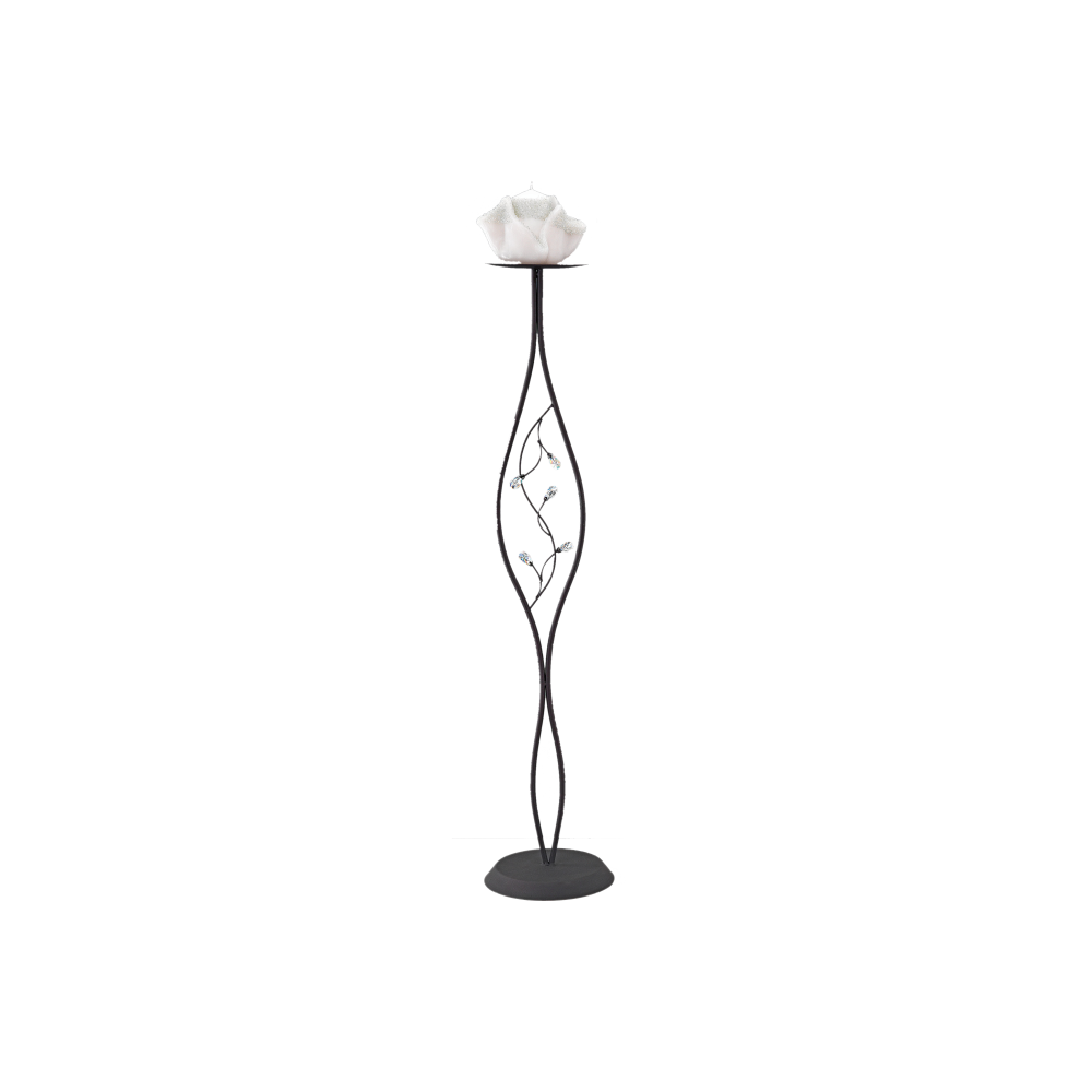 Το κερί στηρίζεται σε μια λεπτή, μεταλλική βάση, η οποία έχει καμπυλωτό σχεδιασμό και διακοσμείται με διακριτικά κρύσταλλα. Τα κρύσταλλα προσθέτουν μια διακριτική λάμψη, χωρίς να αλλοιώνουν την απλότητα του σχεδιασμού. Η μεταλλική βάση έχει σκούρο χρώμα, δημιουργώντας μια όμορφη αντίθεση με το λευκό κερί.