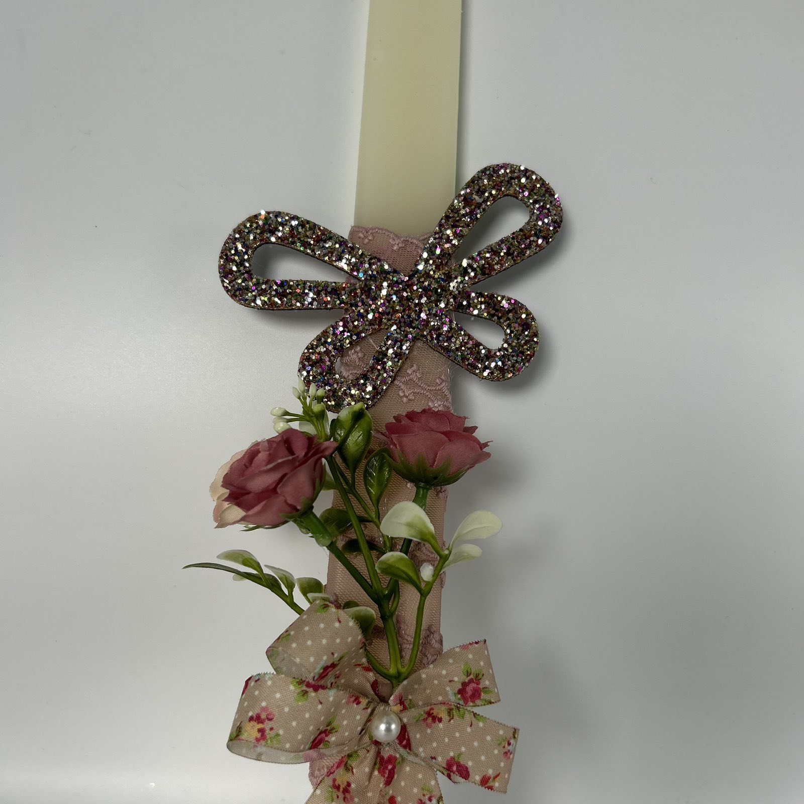 Μια ρομαντική, χειροποίητη πασχαλινή λαμπάδα σε εκρού απόχρωση, διακοσμημένη με λαμπερό στοιχείο φιόγκου με στρασάκια, υφασμάτινες κορδέλες και πανέμορφα λουλούδια. Ιδανική επιλογή για όσους αγαπούν τις κομψές και φλοράλ λεπτομέρειες!