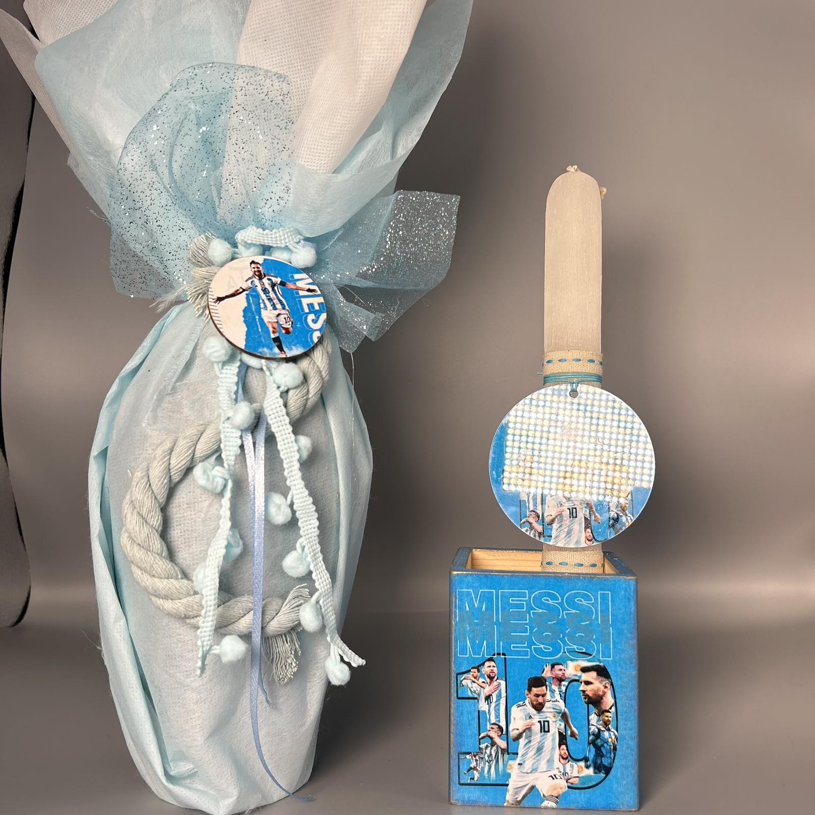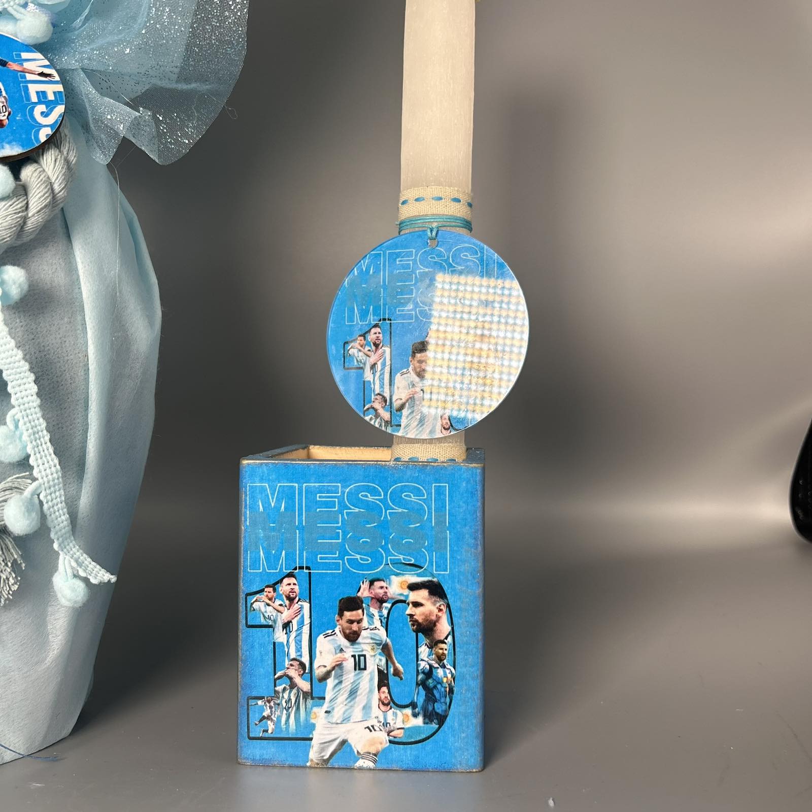Για τους μικρούς ποδοσφαιρόφιλους, μια μοναδική μπλε λαμπάδα με θέμα τον Lionel Messi, συνοδευόμενη από μια εντυπωσιακή μολυβοθήκη στο ίδιο σχέδιο.