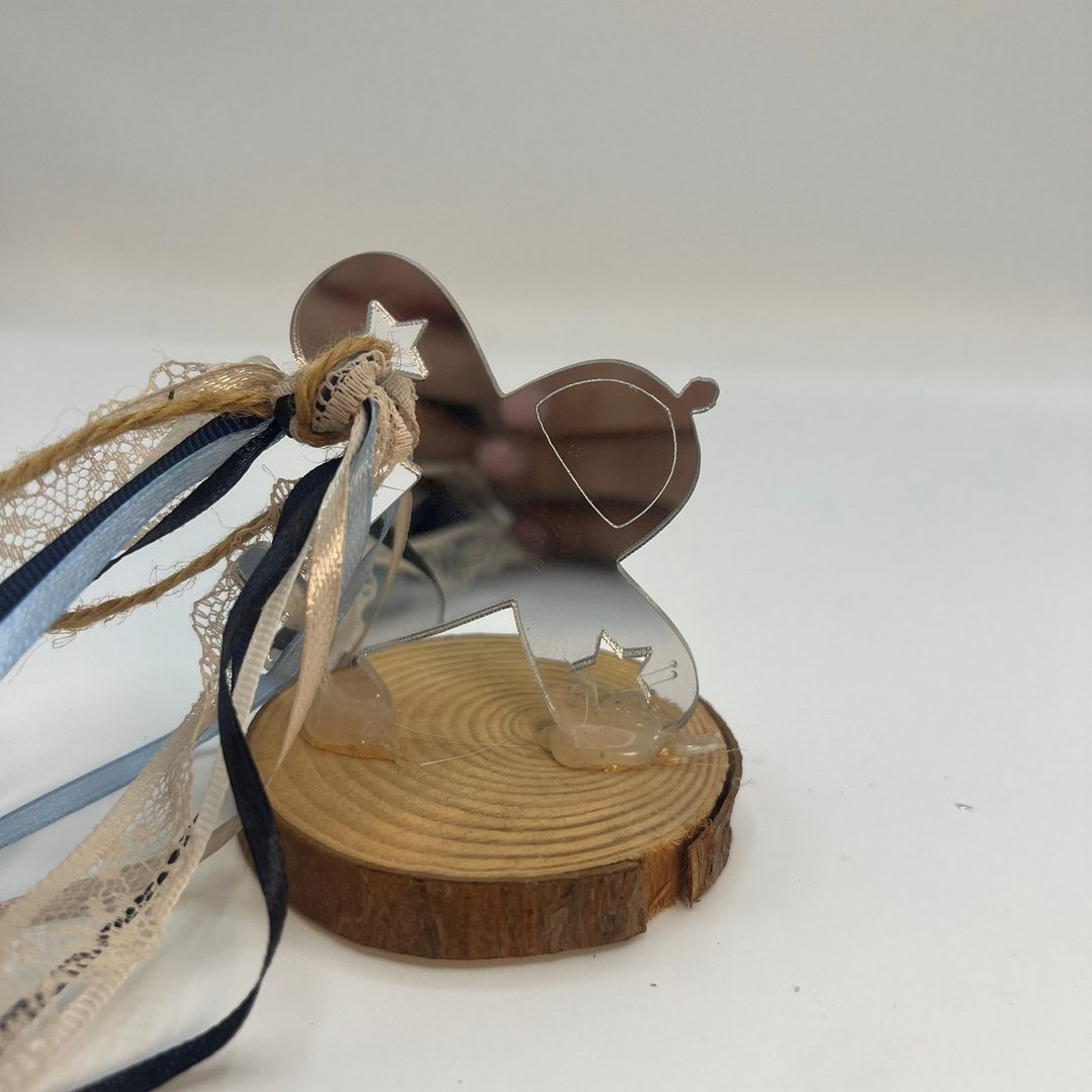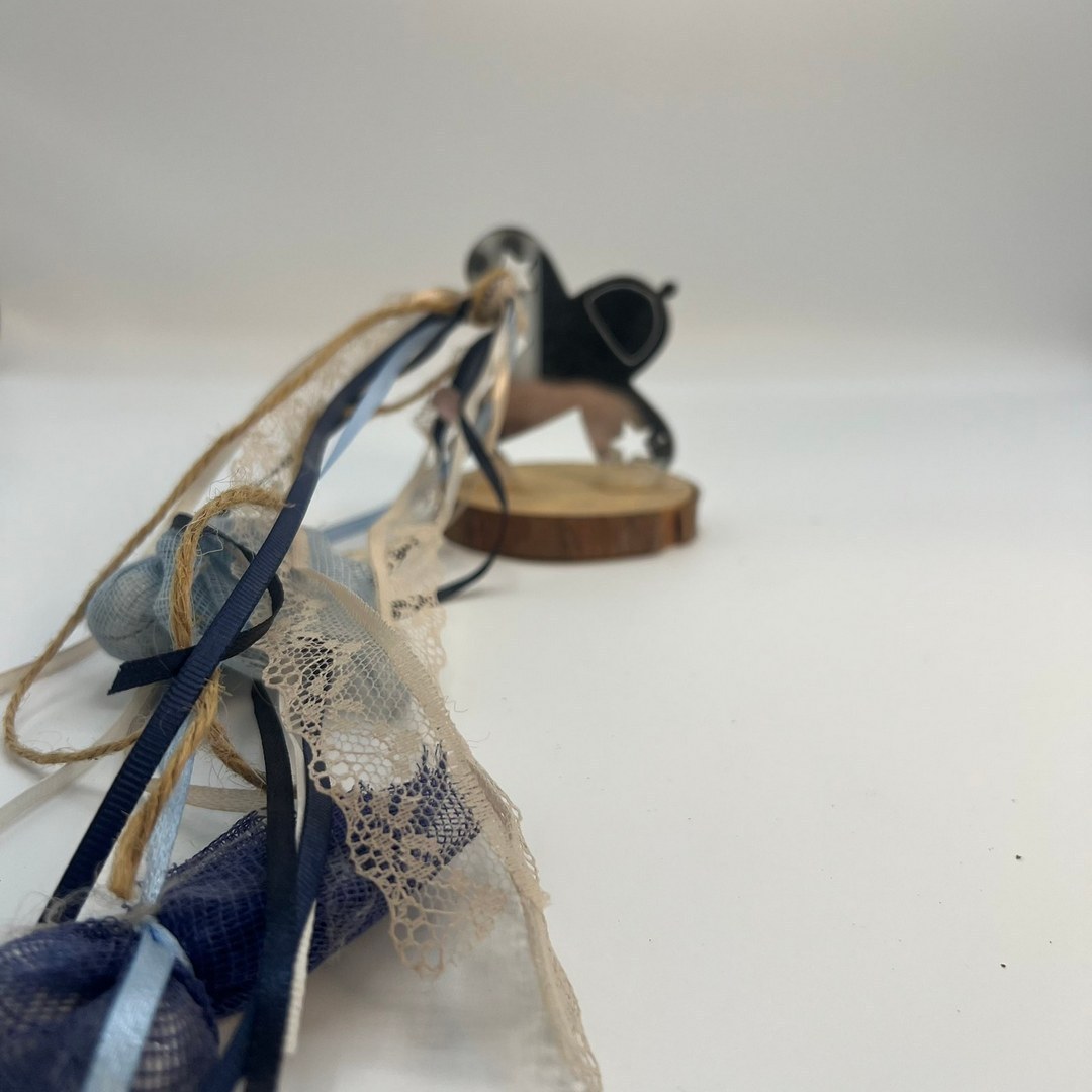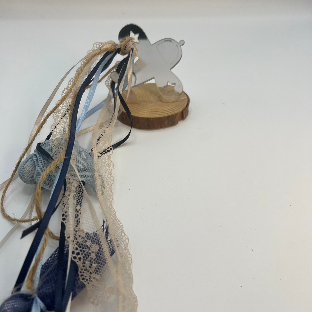 Αυτή η μοναδική μπομπονιέρα βάπτισης είναι εμπνευσμένη από το θέμα του αεροπλάνου και συνδυάζει rustic και vintage στοιχεία. Αποτελείται από μια ξύλινη βάση φυσικού κοπής, πάνω στην οποία στέκεται μια ακρυλική φιγούρα αεροπλάνου με χαριτωμένες λεπτομέρειες. Οι κορδέλες σε μπλε, εκρού και μπεζ αποχρώσεις, καθώς και οι δαντελένιες λεπτομέρειες, χαρίζουν έναν αέρα κομψότητας και νοσταλγίας. Δεμένα επάνω βρίσκονται τούλινα δεματάκια που περιέχουν κουφέτα, δημιουργώντας μια όμορφη και εντυπωσιακή παρουσίαση. Ιδανική επιλογή για μια βάπτιση με αεροπορικό ή ταξιδιωτικό θέμα, προσφέροντας στους καλεσμένους ένα ξεχωριστό αναμνηστικό.