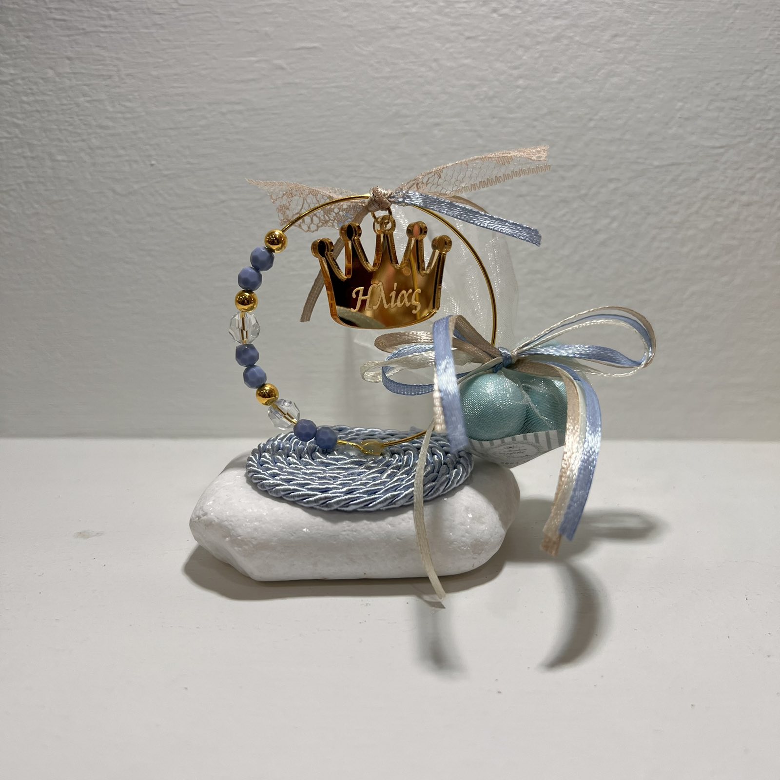 Αυτή η κομψή μπομπονιέρα βάπτισης συνδυάζει τη λάμψη του χρυσού με τις απαλές γαλάζιες αποχρώσεις, δημιουργώντας μια ιδιαίτερα εντυπωσιακή σύνθεση. Στο κέντρο ξεχωρίζει το μεταλλικό στεφάνι, στολισμένο με χρυσή κορώνα που φέρει το όνομα “Ηλίας”, προσφέροντας μια εξατομικευμένη πινελιά. Γυάλινες και χρυσές χάντρες πλαισιώνουν αρμονικά το στεφάνι, ενώ η δαντέλα και οι κορδέλες σε γαλάζιους και λευκούς τόνους ολοκληρώνουν το ρομαντικό σύνολο. Η λευκή βάση εξασφαλίζει σταθερότητα και αναδεικνύει τις λεπτομέρειες, ενώ το πουγκί με τα κουφέτα (προαιρετικά) δίνει την παραδοσιακή νότα που όλοι αγαπάμε. Αυτή η μπομπονιέρα είναι μια εξαιρετική επιλογή για να χαρίσετε στους καλεσμένους σας ένα όμορφο ενθύμιο από τη βάπτιση του παιδιού σας, συνδυάζοντας κλασική αισθητική και μοντέρνο σχεδιασμό.