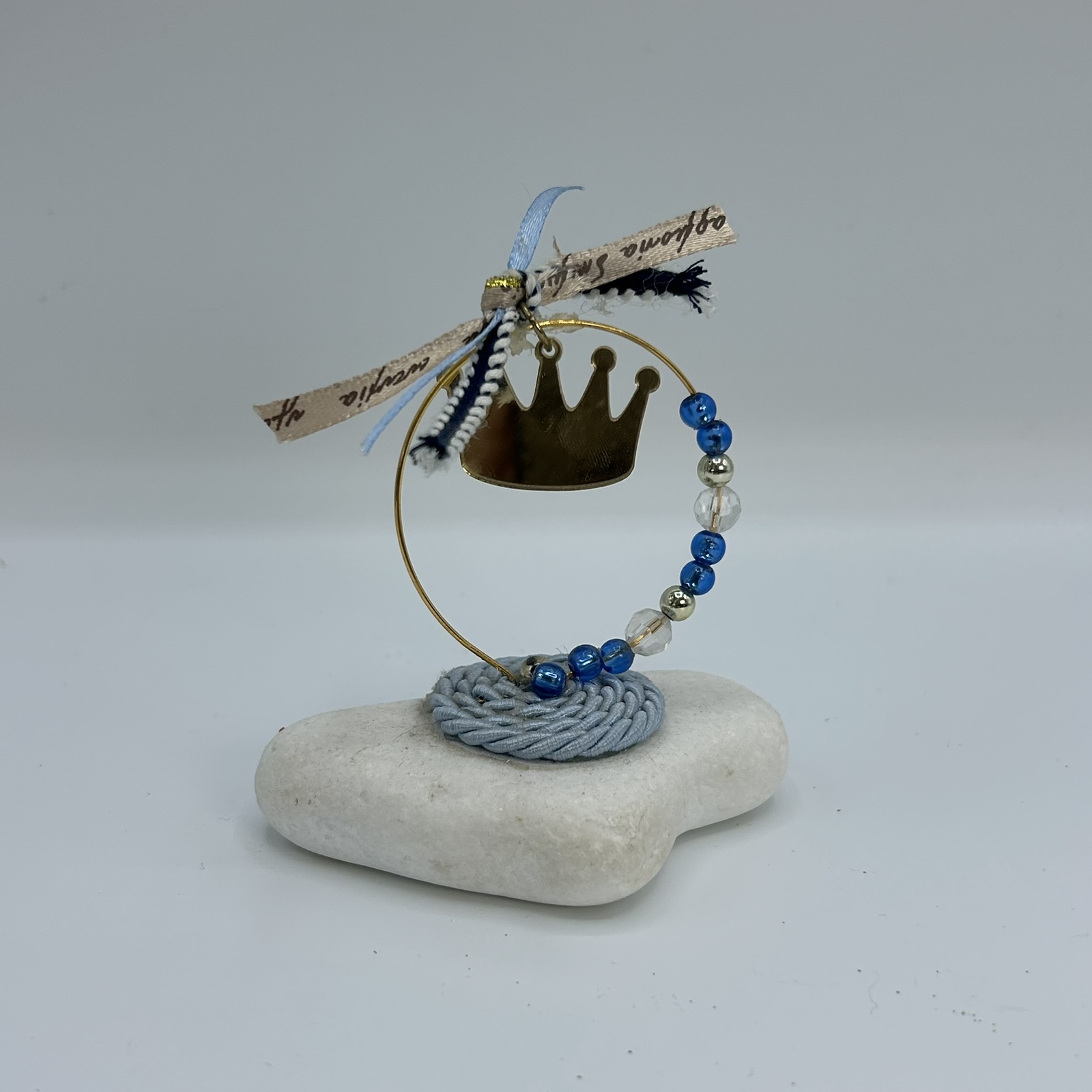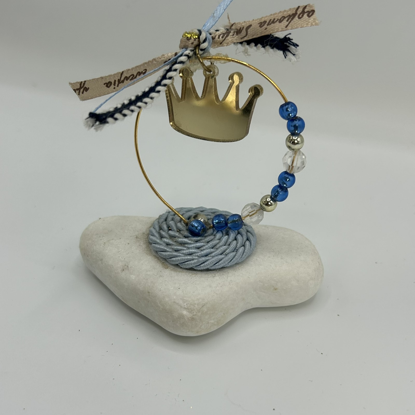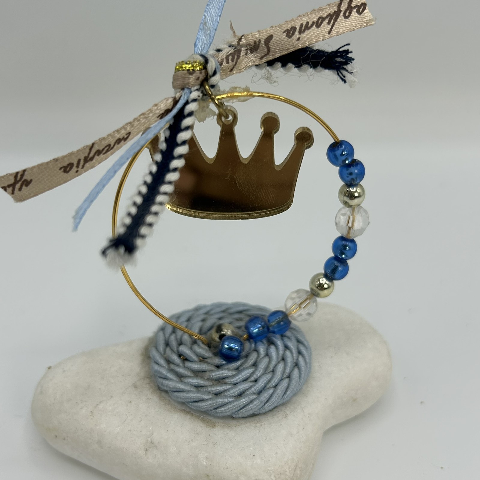 Εντυπωσιακή μπομπονιέρα βάπτισης με χρυσή κορώνα και γαλάζιες λεπτομέρειες, διακοσμημένη με δαντέλα και χάντρες. Ιδανική για μια ξεχωριστή εκδήλωση, προσφέροντας στιλ και διαχρονική κομψότητα