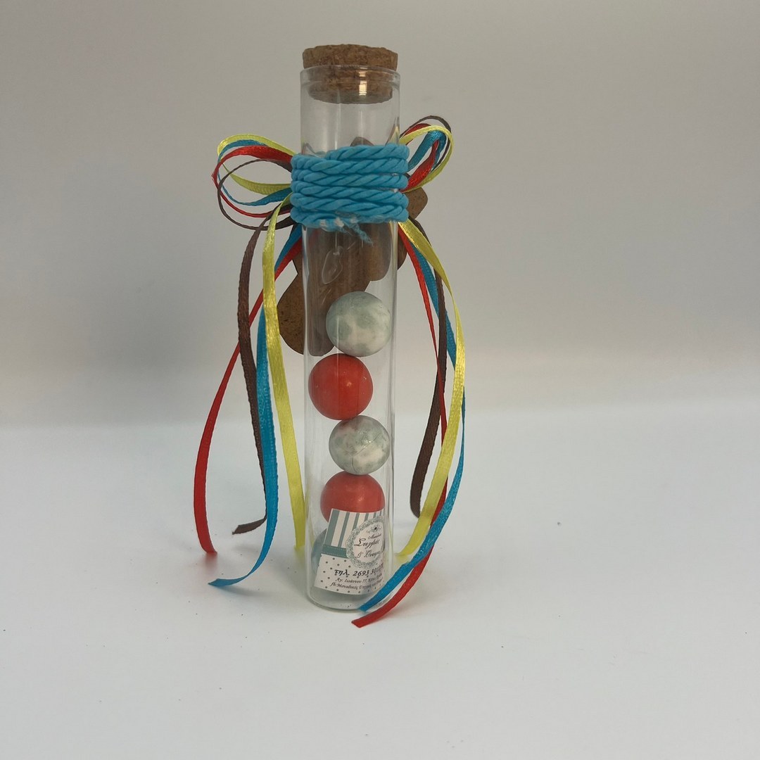Μπομπονιέρα βάπτισης μπουκαλάκι με φελλό, κορδέλες και στοιχείο αμαξάκι