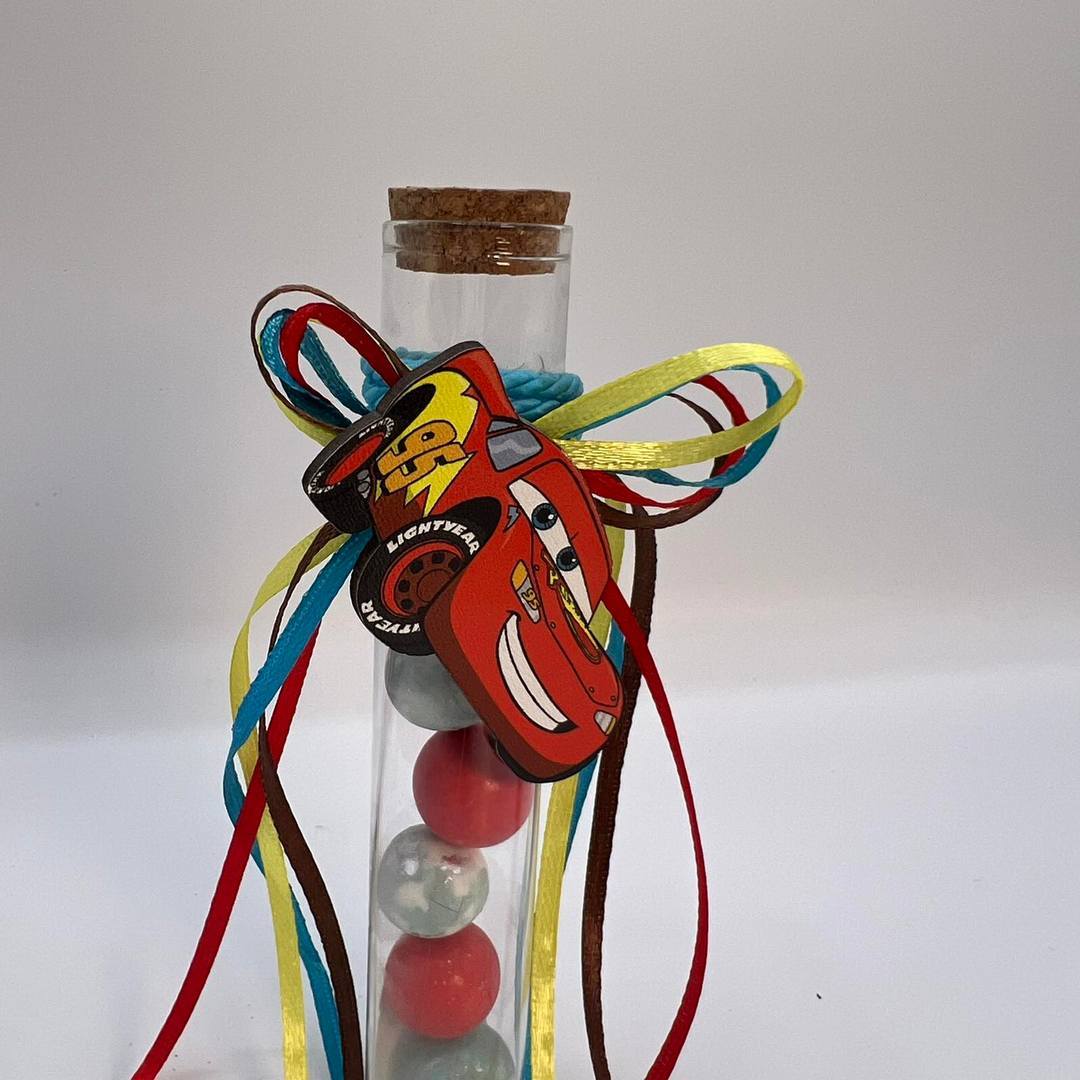 Γυάλινο μπουκαλάκι, γεμάτο με μπλε κουφέτα, διακοσμημένο με κορδέλες σε αποχρώσεις του μπλε και ένα χαρούμενο στοιχείο-αμαξάκι Μακουίν. Μια παιχνιδιάρικη και κομψή μπομπονιέρα, ιδανική για βάπτιση αγοριού.