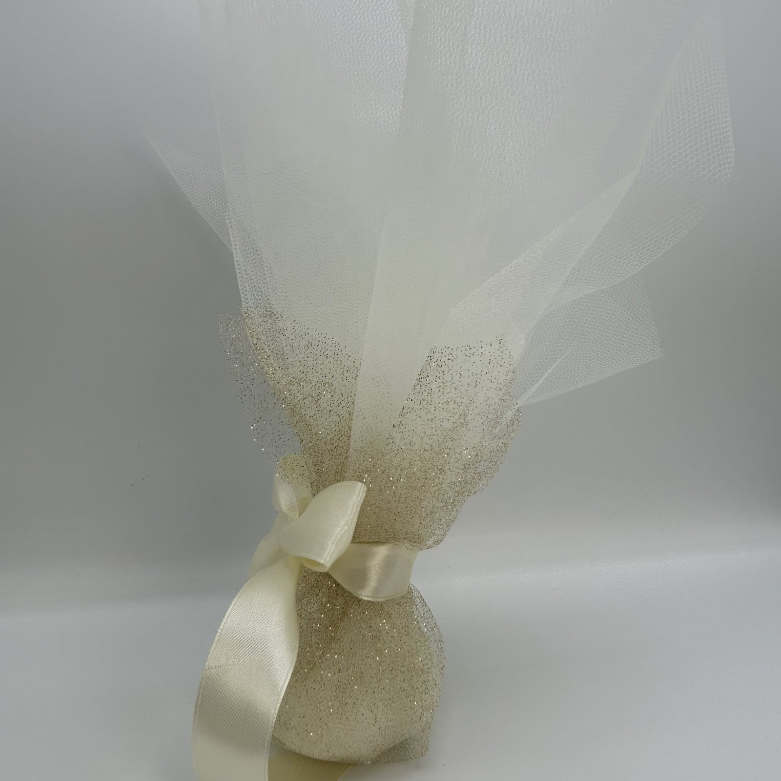 Αυτή η εκλεπτυσμένη και ρομαντική μπομπονιέρα συνδυάζει την κομψότητα με μια αίσθηση πολυτέλειας. Είναι φτιαγμένη από δύο διαφορετικά υλικά: ένα λαμπερό, γκλίτερ τούλι στο εσωτερικό που προσθέτει μια διακριτική λάμψη και ένα μαλακό, ιβουάρ τούλι που αγκαλιάζει όμορφα το σύνολο.