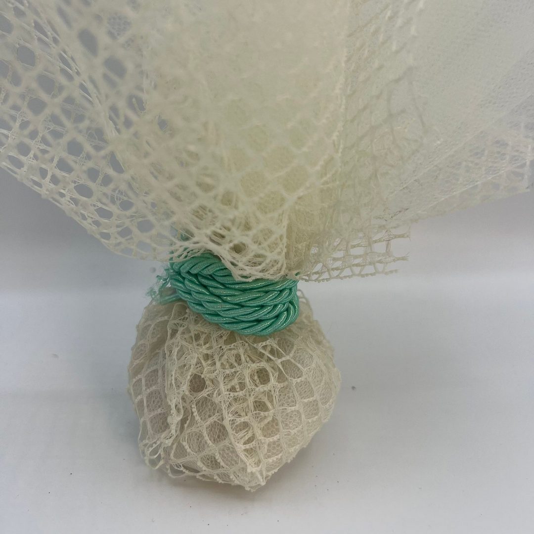 Αυτή η μπομπονιέρα γάμου ξεχωρίζει για τον αρμονικό συνδυασμό των υλικών της. Το εσωτερικό τούλι χαρίζει ανάλαφρη αίσθηση, ενώ το εξωτερικό διχτυωτό ύφασμα σε ιβουάρ απόχρωση προσθέτει μια ρουστίκ και κομψή πινελιά. Το σύνολο ολοκληρώνεται με ένα περίτεχνο πράσινο κορδόνι, που προσδίδει μια φυσική, γήινη νότα και κάνει αυτή τη μπομπονιέρα ιδανική για γάμους με vintage ή boho αισθητική. Ένας ιδιαίτερος συνδυασμός παράδοσης και μοντέρνας φινέτσας!