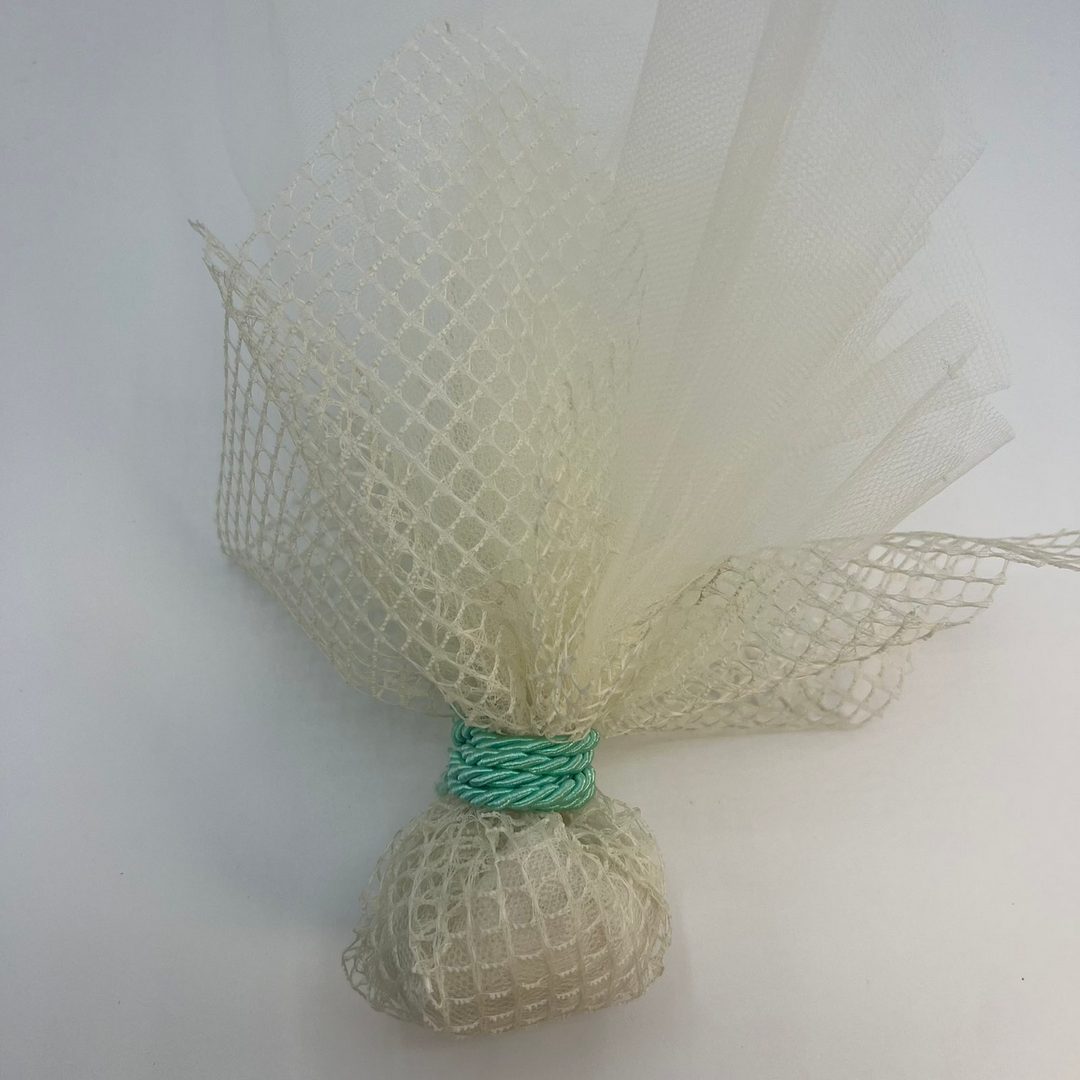 Μια μοναδική μπομπονιέρα γάμου με διχτυωτό ύφασμα και τούλι, δεμένη με περίτεχνο πράσινο κορδόνι, που αποπνέει φυσικότητα και διακριτική πολυτέλεια.