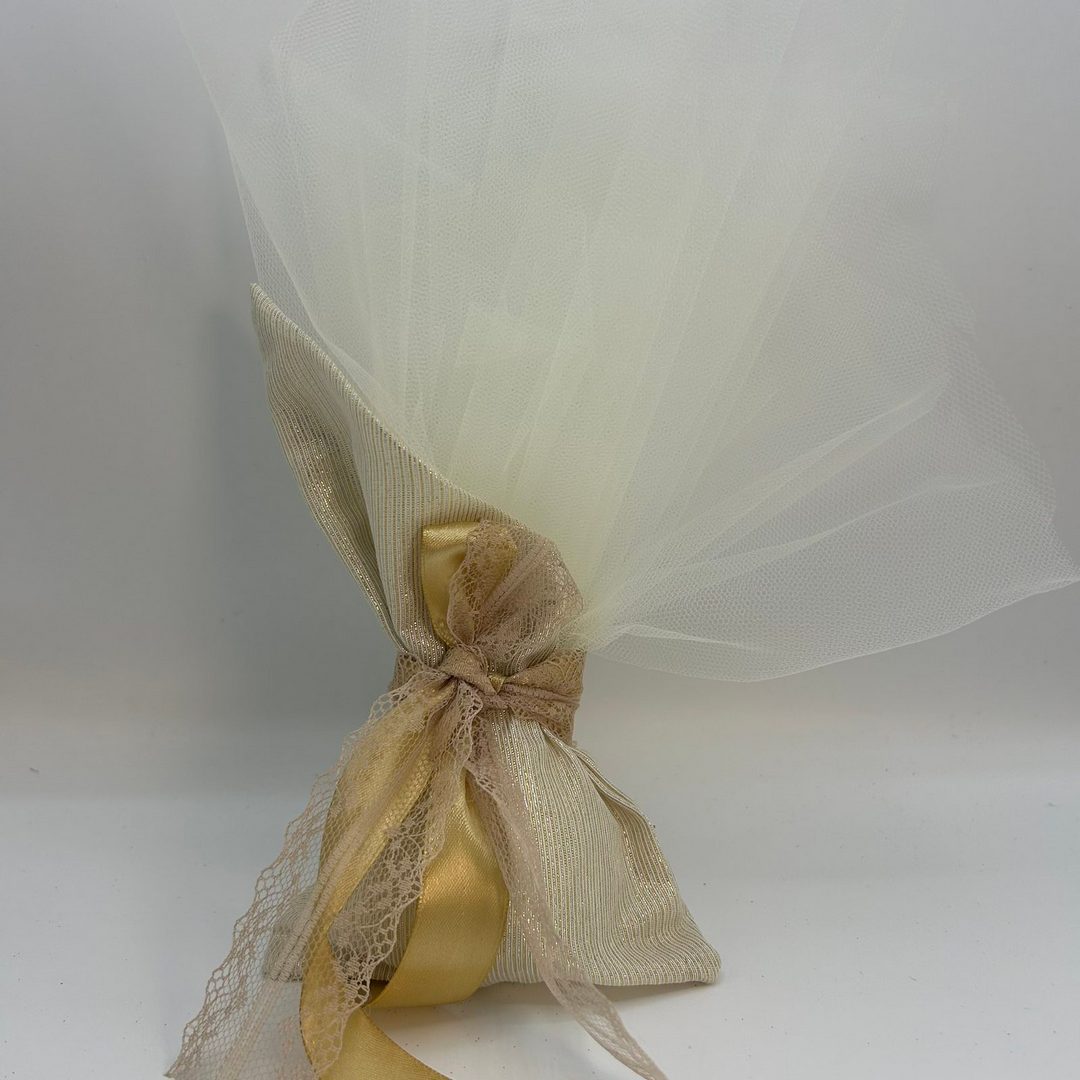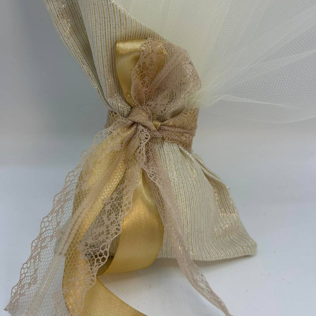 Αυτή η πανέμορφη μπομπονιέρα γάμου είναι η τέλεια επιλογή για ένα κομψό και ρομαντικό γάμο. Το υφασμάτινο πουγκί, σε απαλές μπεζ-χρυσές αποχρώσεις, προσδίδει μια αίσθηση πολυτέλειας και φυσικότητας, ενώ το ανάλαφρο τούλι δημιουργεί μια αέρινη και εντυπωσιακή εμφάνιση. Η λεπτομέρεια της φίνας δαντέλας σε γήινους τόνους ενισχύει την κλασική αισθητική, προσφέροντας μια διαχρονική φινέτσα. Ιδανική επιλογή για ζευγάρια που επιθυμούν να χαρίσουν στους καλεσμένους τους ένα κομψό και εκλεπτυσμένο αναμνηστικό της πιο ξεχωριστής ημέρας της ζωής τους.