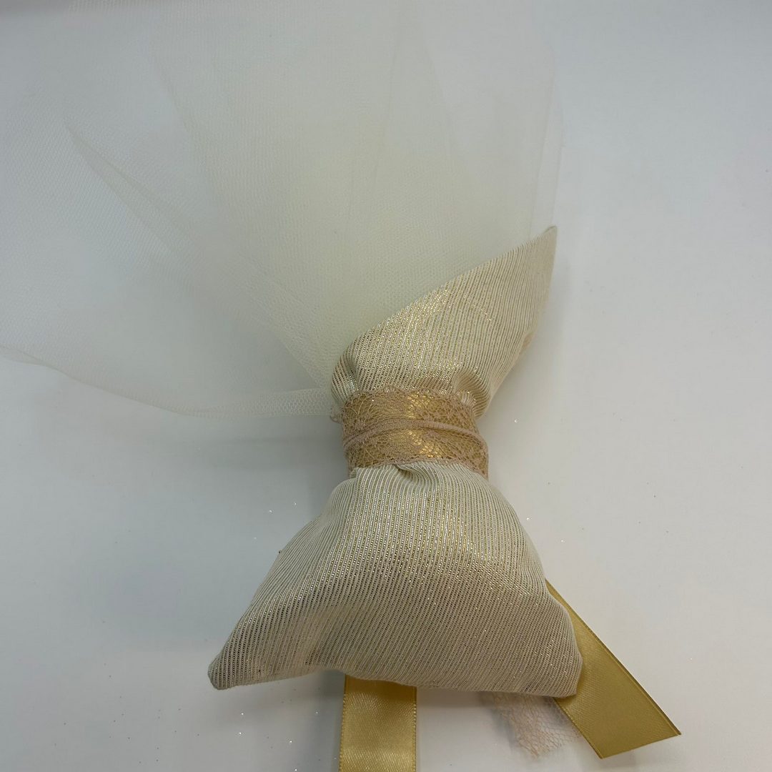 Μια ρομαντική μπομπονιέρα γάμου, συνδυάζοντας ένα κομψό υφασμάτινο πουγκί σε απαλές μπεζ-χρυσές αποχρώσεις με λεπτομέρειες από φίνα δαντέλα και αέρινο τούλι. Ένα διαχρονικό δώρο για τους καλεσμένους σας.