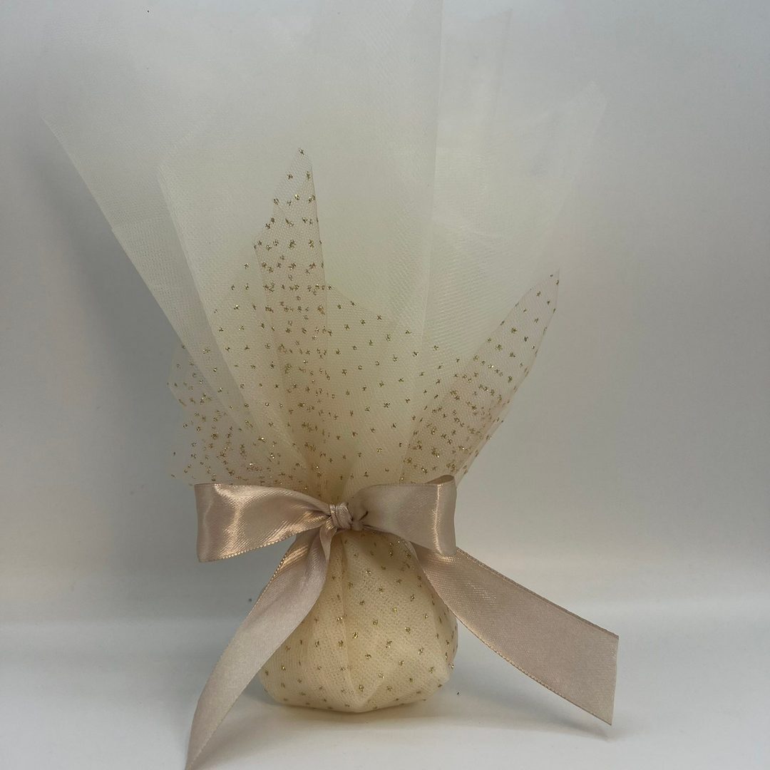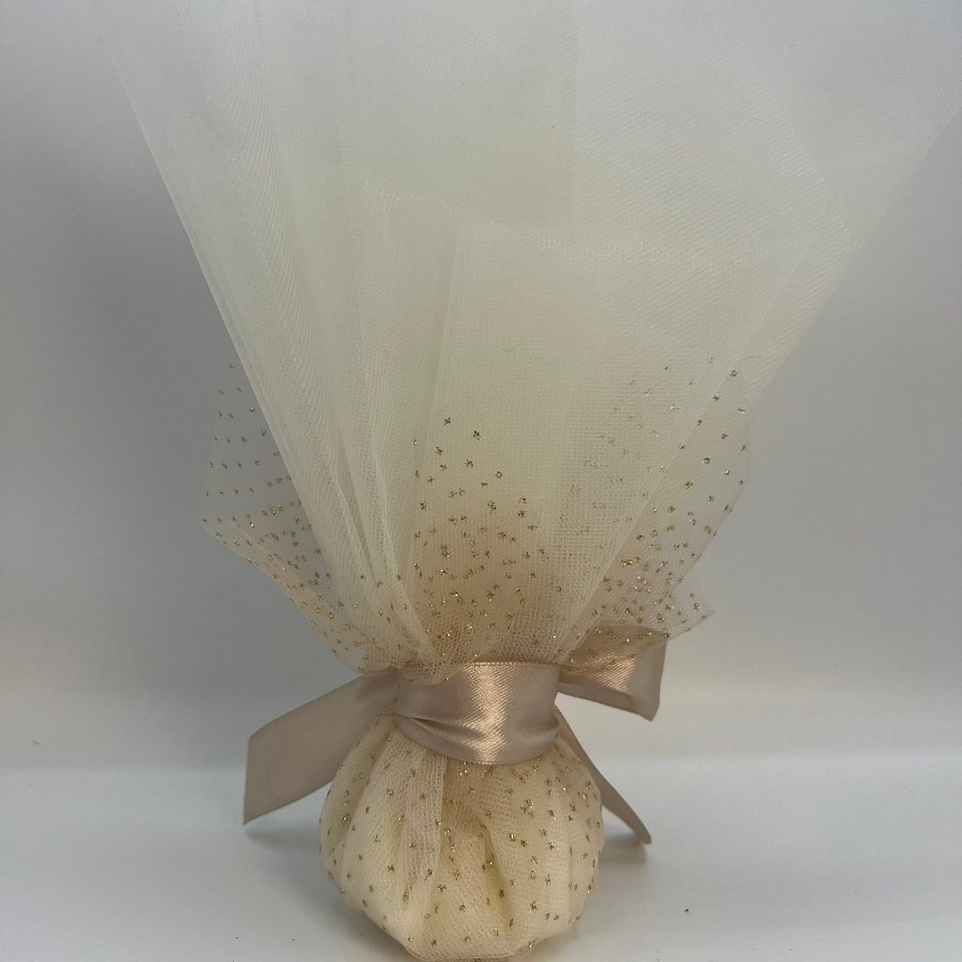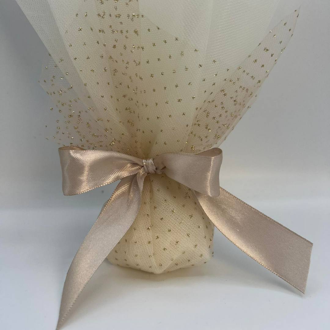 Αυτή η μοναδική μπομπονιέρα γάμου αποπνέει κομψότητα και πολυτέλεια, κάνοντας την τέλεια επιλογή για μια εκδήλωση που θέλει να ξεχωρίσει. Η βάση της είναι τυλιγμένη σε εκλεπτυσμένη οργάντζα, η οποία διακοσμείται με χρυσές λεπτομέρειες που χαρίζουν μια διακριτική λάμψη. Ο φιόγκος από σατέν κορδέλα σε απόχρωση του απαλού χρυσού συμπληρώνει το σύνολο, προσθέτοντας μια αίσθηση φινέτσας. Η μπομπονιέρα αυτή είναι η τέλεια επιλογή για ένα γάμο γεμάτο ρομαντισμό, κομψότητα και πολυτέλεια, αφήνοντας στους καλεσμένους μια αξέχαστη ανάμνηση της ξεχωριστής αυτής ημέρας.