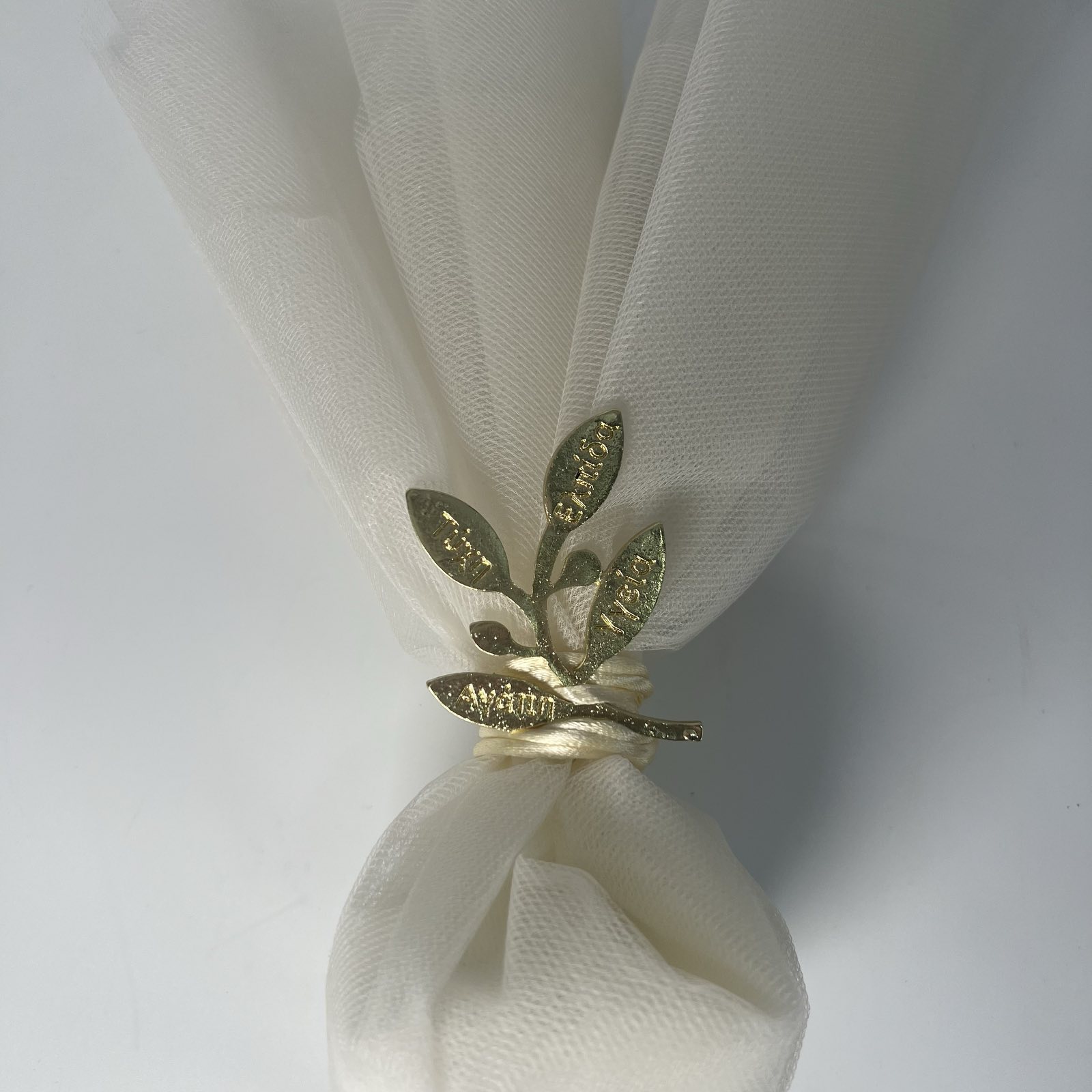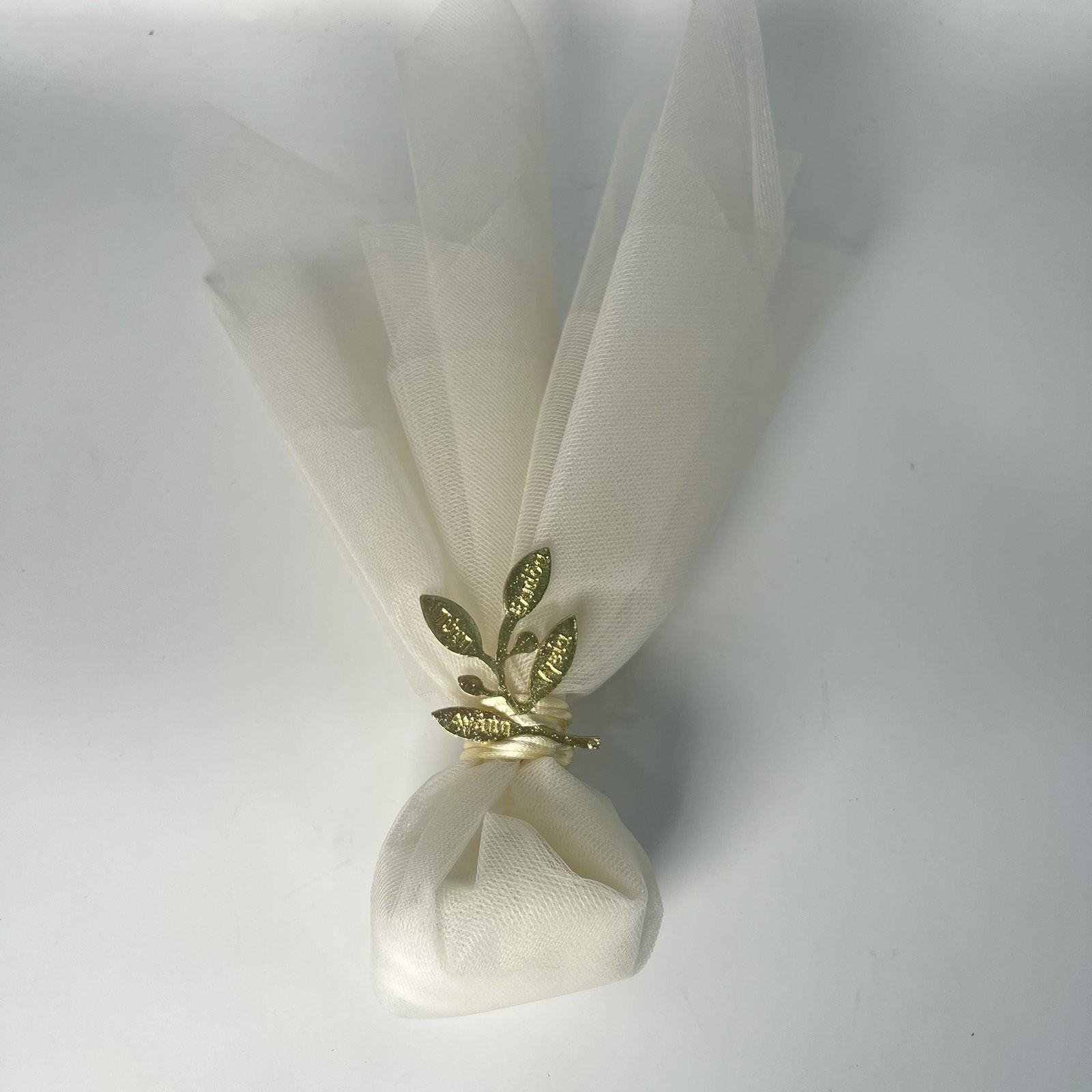 Μια κομψή μπομπονιέρα, με λευκό τούλι και χρυσό διακοσμητικό φύλλο, προσφέρει ένα φυσικό και εκλεπτυσμένο δώρο για κάθε ξεχωριστή στιγμή.