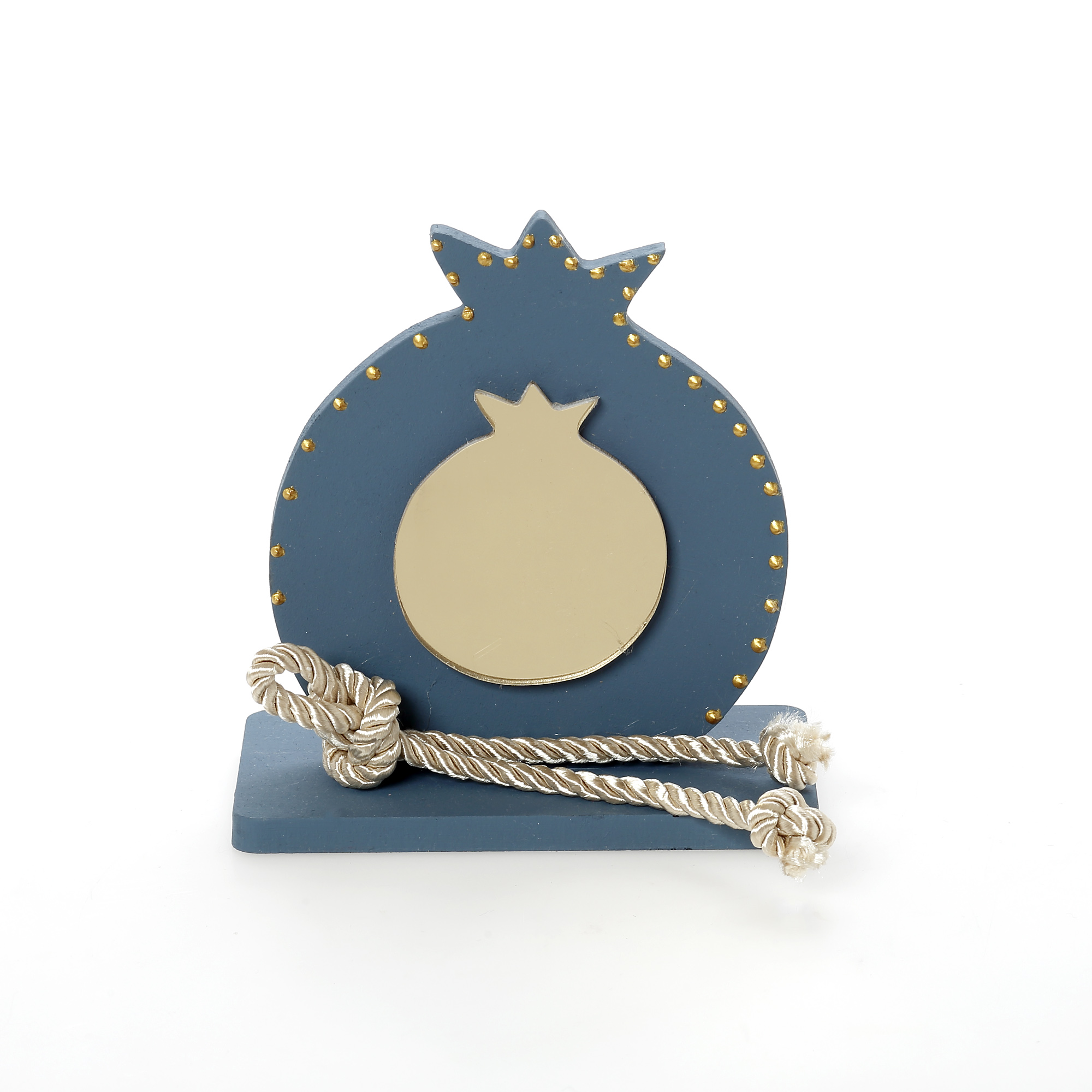 Ξύλινο γούρι ρόδι με βάση, σε μπλε χρώμα, με χρυσό plexiglass ρόδι και χρυσό κρίκοΔιαστάσεις: 12Χ12