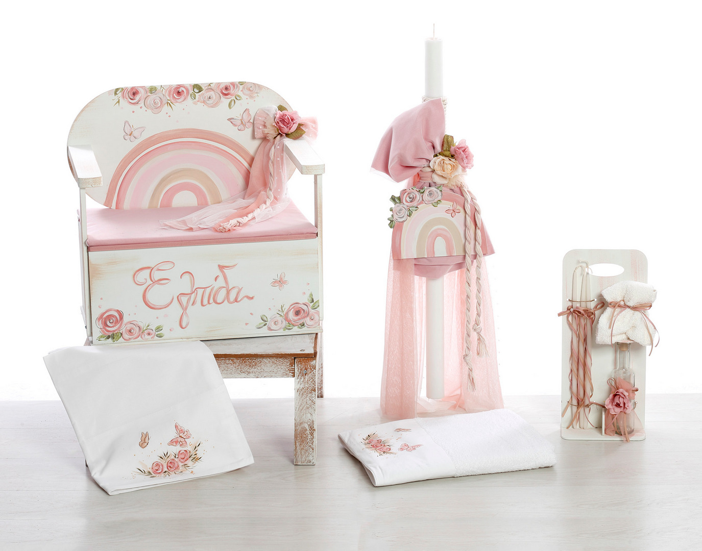 - Ένα μαγευτικό σετ βάπτισης με ξύλινο μπαούλο-καρέκλα, λαμπάδα, λαδόπανα και σετ λαδιού, διακοσμημένο με ουράνιο τόξο, λουλούδια, ροζ τούλι και δαντέλα, με το όνομα “Ελπίδα”. Ιδανικό για μια γλυκιά και παραμυθένια βάπτιση.