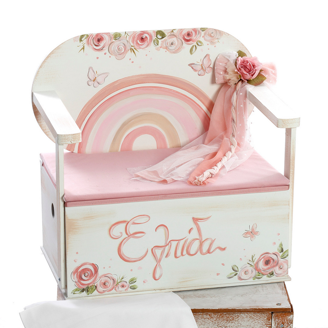 - Ένα ξύλινο μπαούλο-καρέκλα βάπτισης, διακοσμημένο με ουράνιο τόξο, λουλούδια, το όνομα “Ελπίδα”, ροζ τούλι και δαντέλα, που θα αποθηκεύσει με στυλ τα βαπτιστικά ρούχα και θα αποτελέσει ένα όμορφο διακοσμητικό για το παιδικό δωμάτιο.