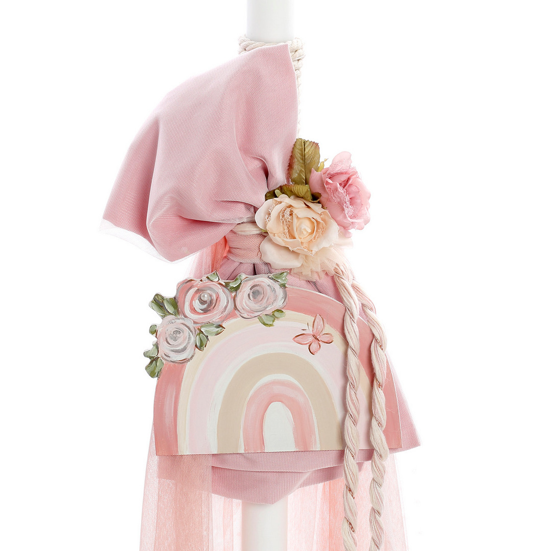 - Μια λαμπάδα βάπτισης με ασορτί διακόσμηση ουράνιου τόξου, ροζ τούλι και λουλούδια, που θα φωτίσει τη στιγμή της βάπτισης.