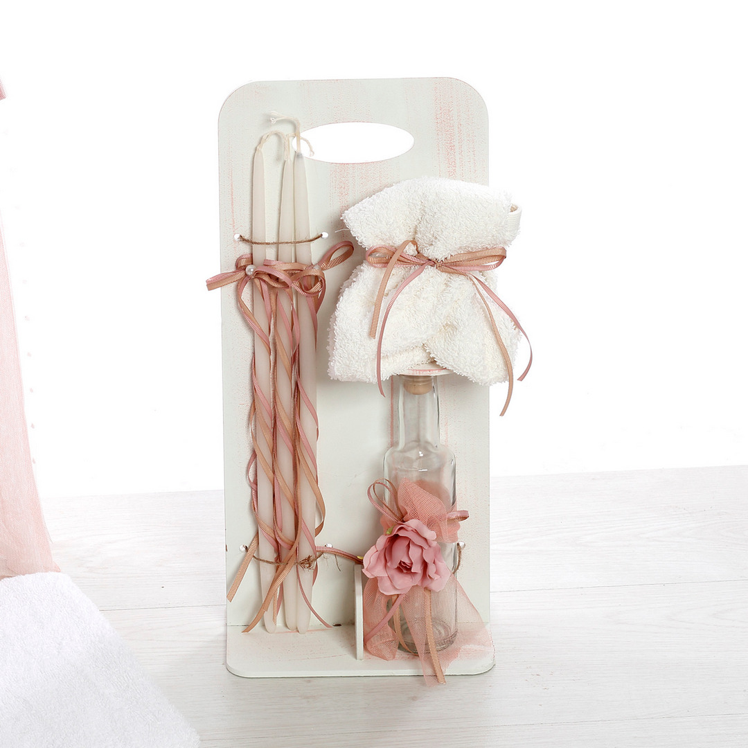 - Ένα σετ λαδιού με μπουκάλι λαδιού, σαπούνι και κεράκια, διακοσμημένα με ροζ κορδέλες και λουλούδια.