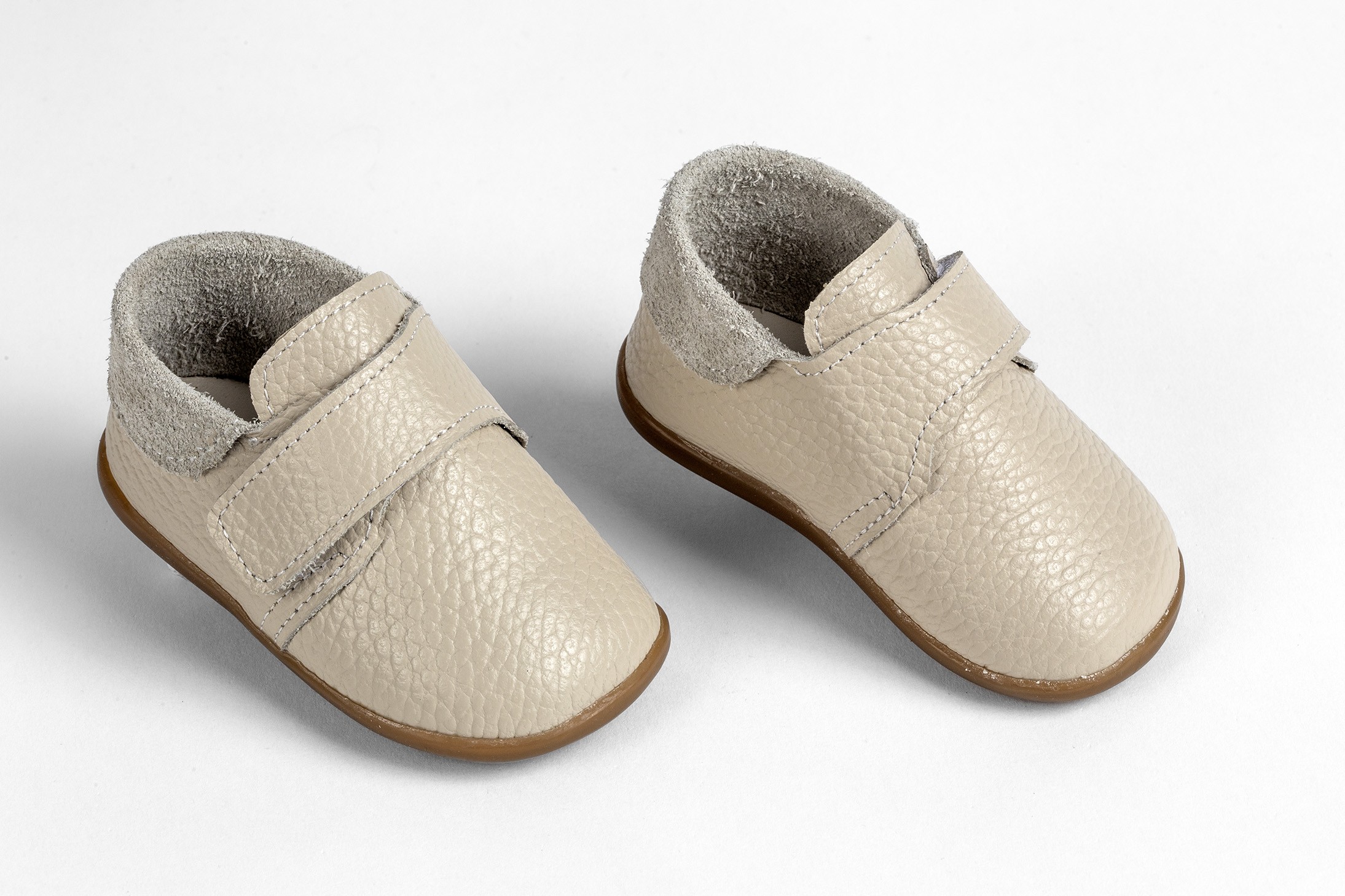 Η φωτογραφία παρουσιάζει ένα ζευγάρι τρυφερά παπουτσάκια πρώτων βημάτων, σχεδιασμένα για να προσφέρουν άνεση και στήριξη στα πρώτα βήματα του μωρού. Τα παπουτσάκια είναι κατασκευασμένα από μαλακό, μπεζ δέρμα, το οποίο προσδίδει μια αίσθηση ζεστασιάς και απαλότητας. Το μπεζ χρώμα είναι κλασικό και ευέλικτο, ταιριάζοντας με διάφορα ρούχα.