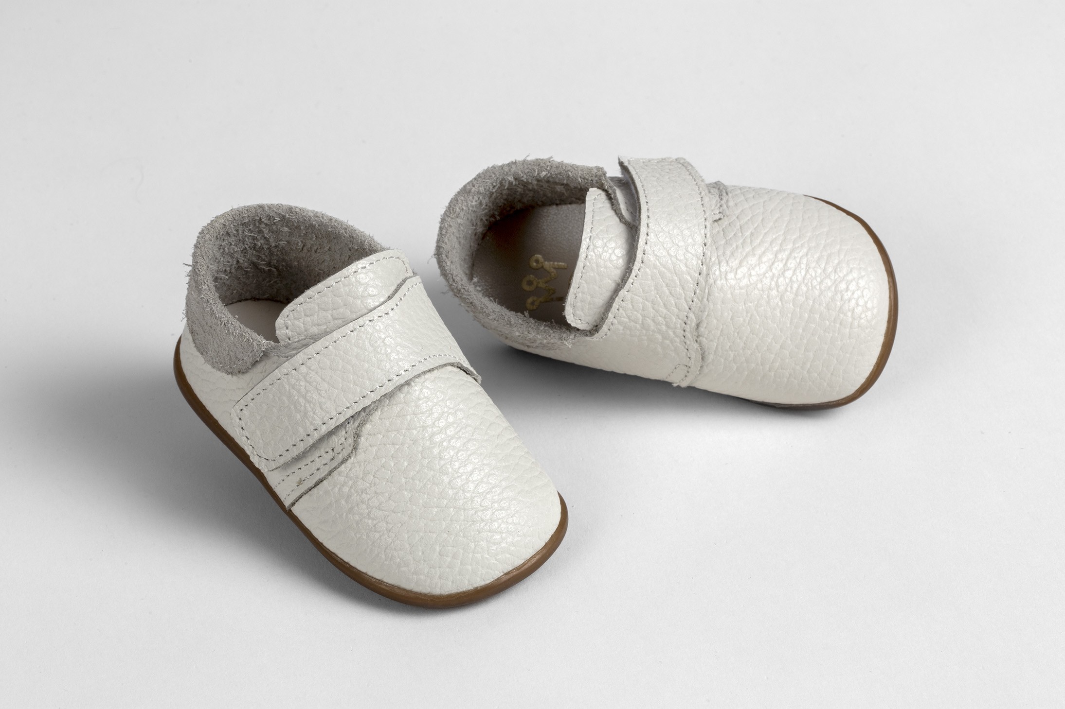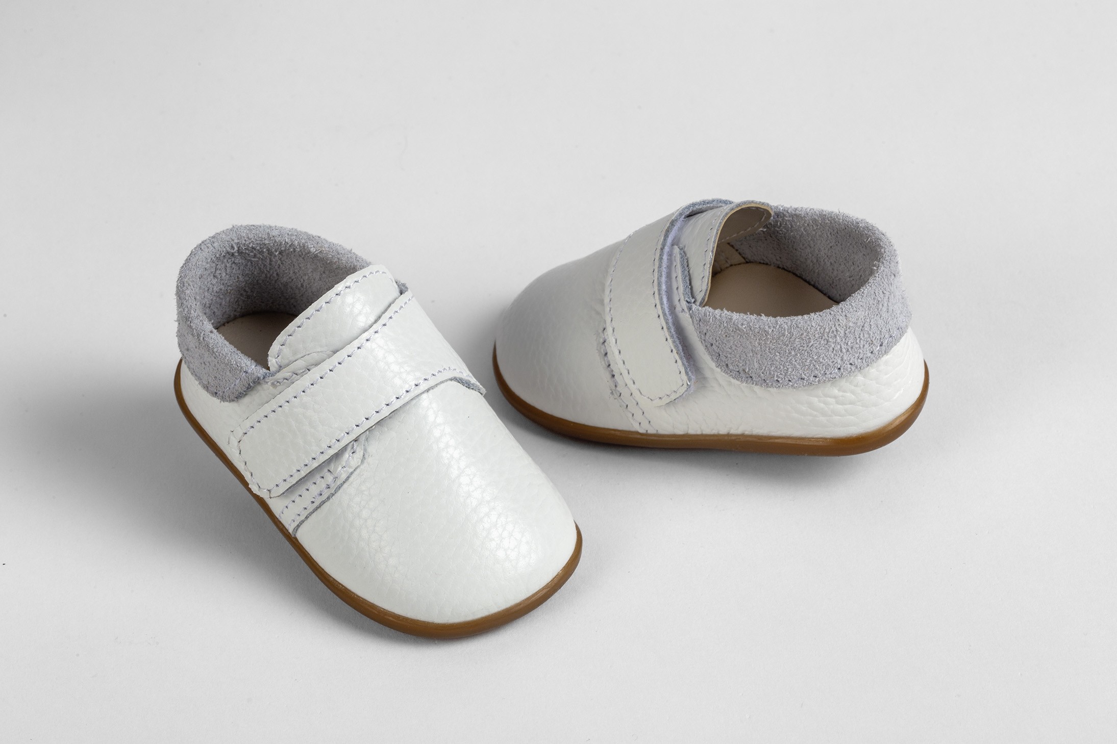 Η φωτογραφία παρουσιάζει ένα ζευγάρι τρυφερά παπουτσάκια πρώτων βημάτων, σχεδιασμένα για να προσφέρουν άνεση και στήριξη στα πρώτα βήματα του μωρού. Τα παπουτσάκια είναι κατασκευασμένα από μαλακό, λευκό δέρμα, το οποίο προσδίδει μια αίσθηση καθαρότητας και απαλότητας. Το λευκό χρώμα είναι κλασικό και ευέλικτο, ταιριάζοντας με διάφορα ρούχα.