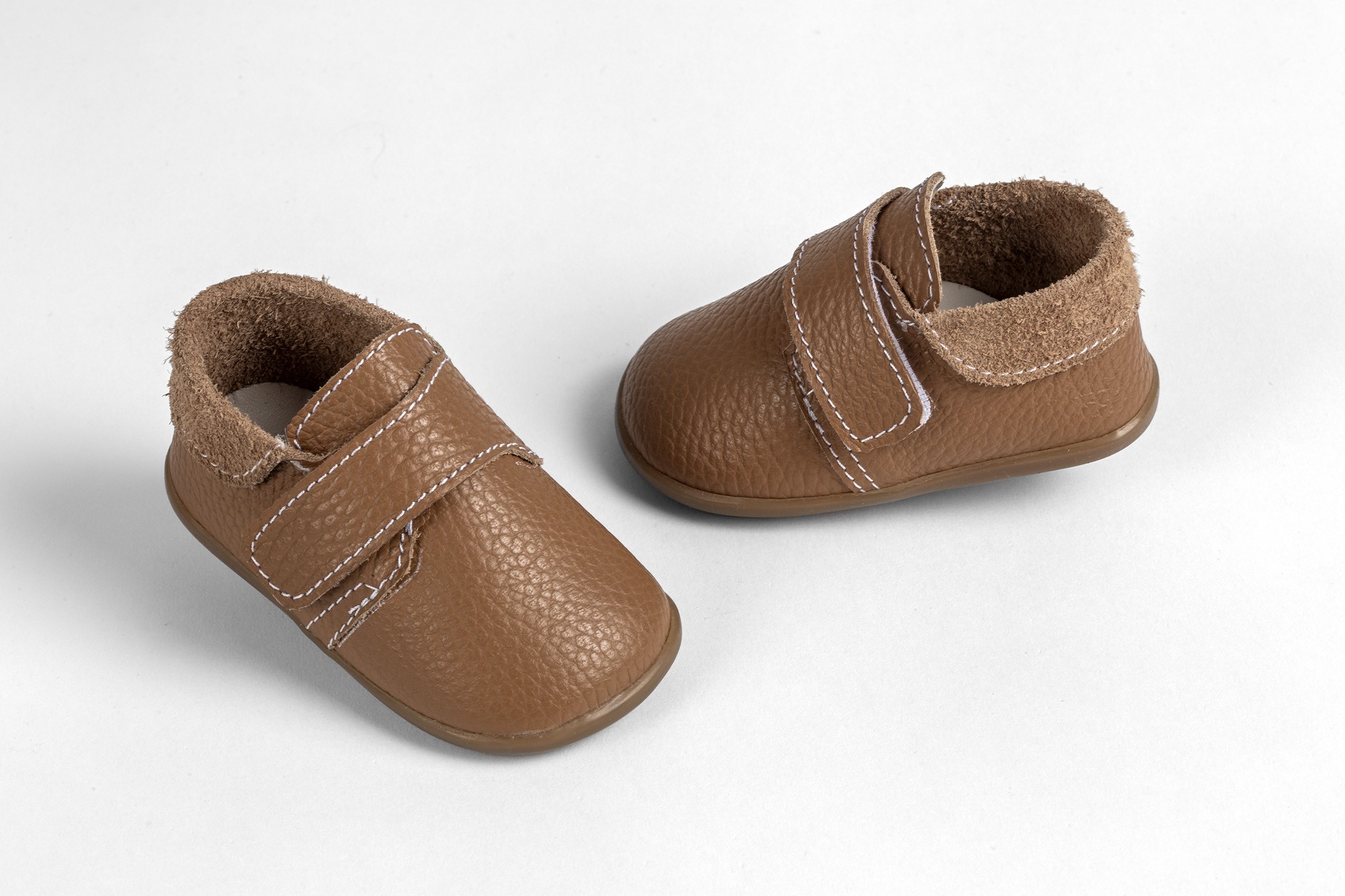 Η φωτογραφία παρουσιάζει ένα ζευγάρι ζεστά παπουτσάκια πρώτων βημάτων, σχεδιασμένα για να προσφέρουν άνεση και στήριξη στα πρώτα βήματα του μωρού. Τα παπουτσάκια είναι κατασκευασμένα από μαλακό, καφέ δέρμα, το οποίο προσδίδει μια αίσθηση ζεστασιάς και φυσικότητας. Το καφέ χρώμα είναι κλασικό και ευέλικτο, ταιριάζοντας με διάφορα ρούχα.