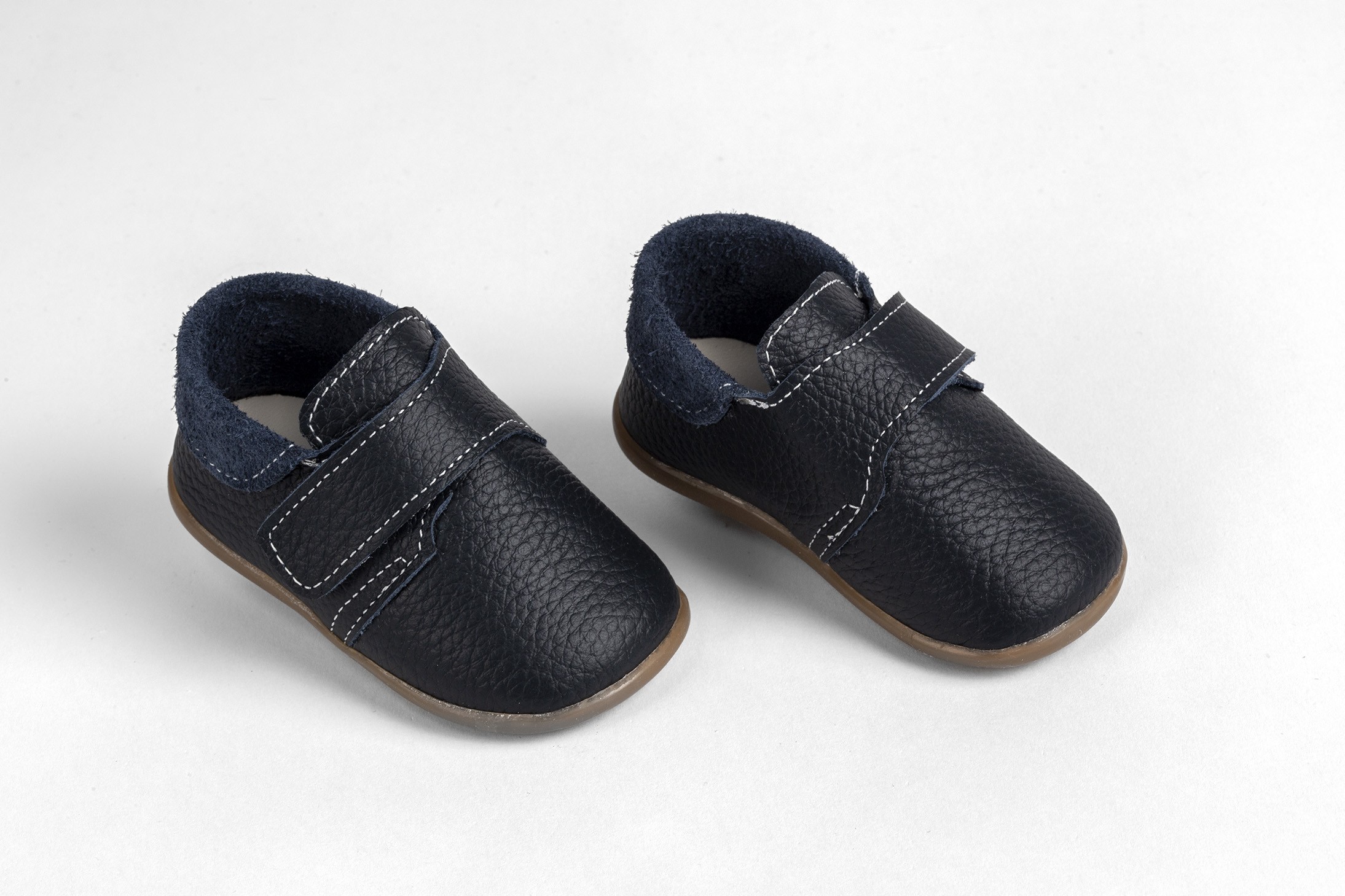 Η φωτογραφία παρουσιάζει ένα ζευγάρι ναυτικού στυλ παπουτσάκια πρώτων βημάτων, σχεδιασμένα για να προσφέρουν άνεση και στήριξη στα πρώτα βήματα του μωρού. Τα παπουτσάκια είναι κατασκευασμένα από μαλακό, μπλε δέρμα, το οποίο προσδίδει μια αίσθηση κομψότητας και ναυτικής έμπνευσης. Το μπλε χρώμα είναι κλασικό και ευέλικτο, ταιριάζοντας με διάφορα ρούχα.