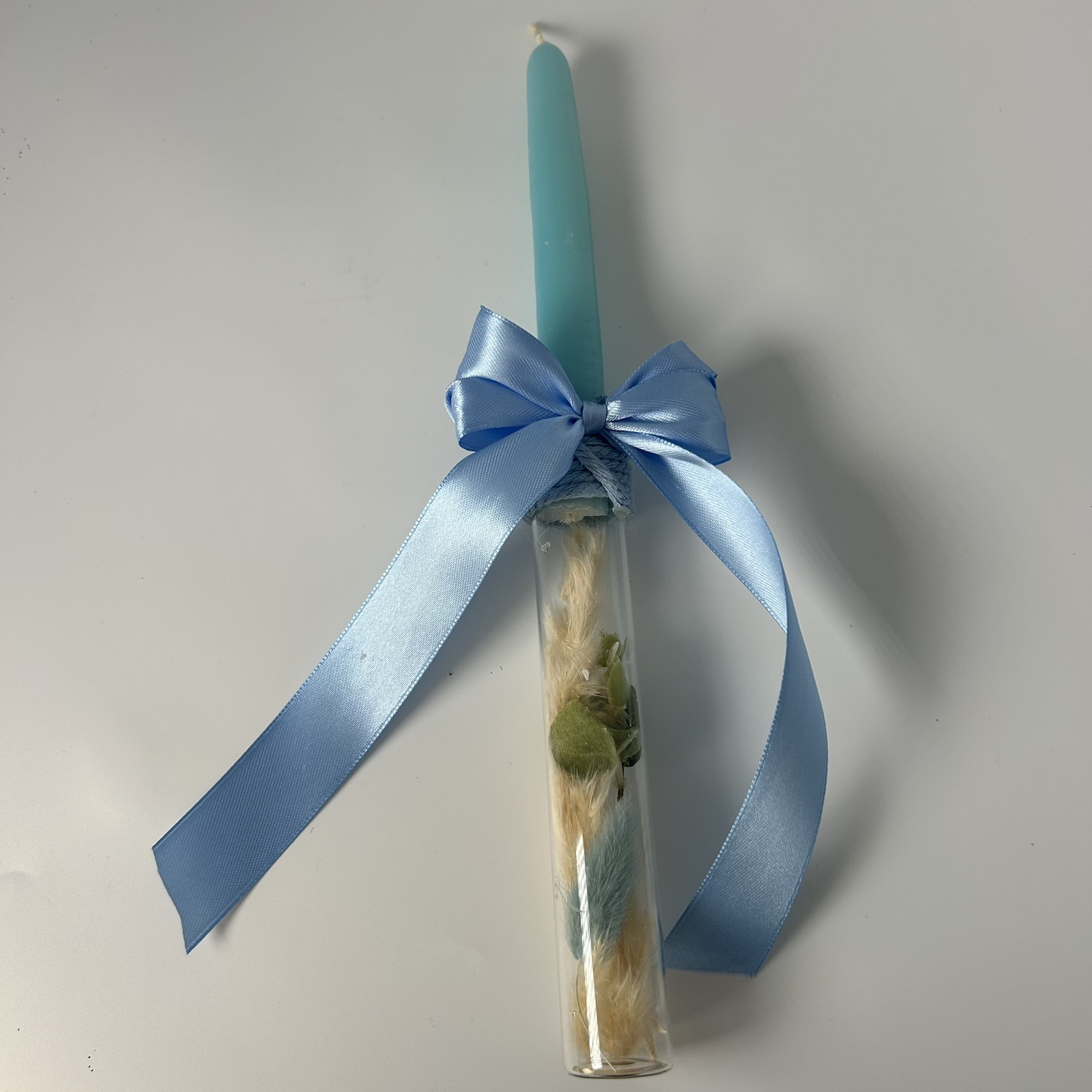 Μια κομψή πασχαλινή λαμπάδα σε απαλό γαλάζιο, διακοσμημένη με έναν διαφανή σωλήνα γεμάτο αποξηραμένα άνθη και φύλλα. Συμπληρώνεται με ένα υπέροχο σατέν φιόγκο, προσδίδοντας έναν αέρα ρομαντισμού και φινέτσας. Ιδανική επιλογή για όσους αγαπούν τις minimal και φυσικές λεπτομέρειες! 💙✨