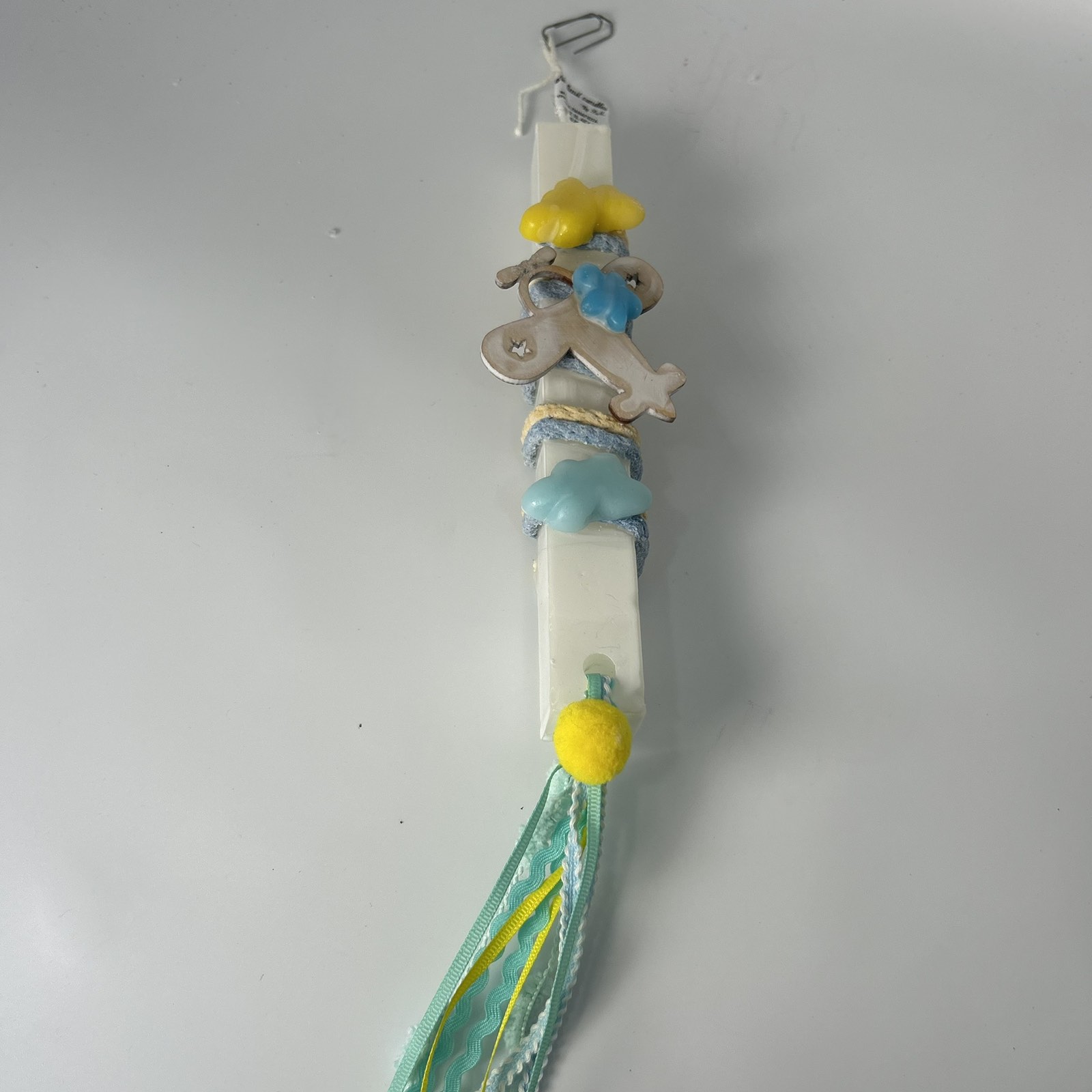 Η λαμπάδα είναι φτιαγμένη με προσοχή στη λεπτομέρεια και συνδυάζει στοιχεία παιχνιδιάρικα, χαρούμενα και πολύχρωμα. Το αεροπλάνο και τα σύννεφα δημιουργούν ένα παιδικό και διασκεδαστικό θέμα, ενώ οι κορδέλες και το πον-πον προσθέτουν χρώμα και υφή. Είναι ιδανική για ένα παιδί που αγαπά τα αεροπλάνα και τα έντονα χρώματα.